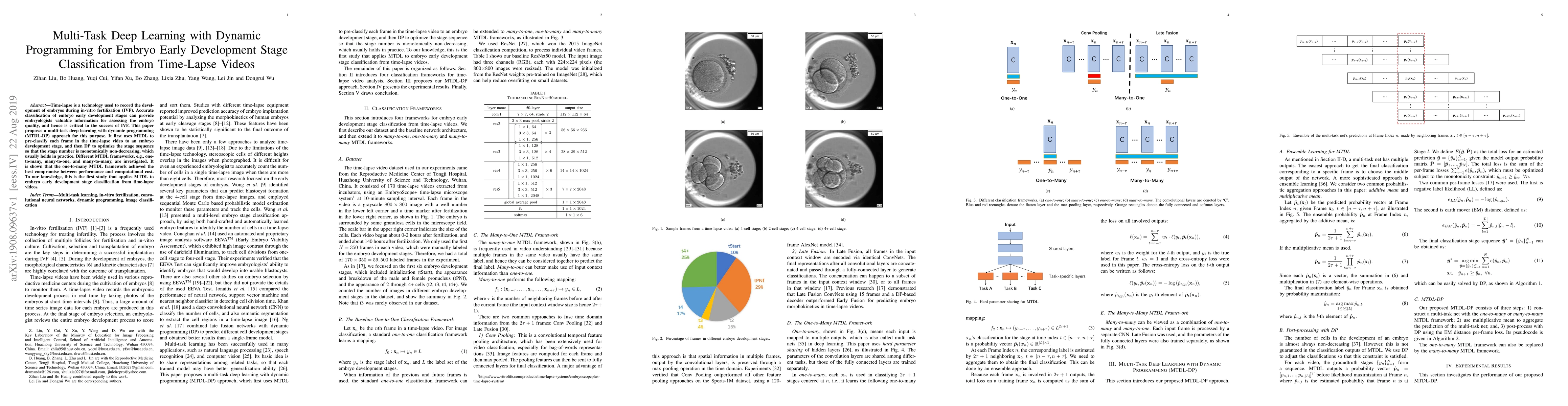 This paper proposes a multi-task deep learning with dynamic programming (MTDL-DP) approach to classify embryo development stages from time-lapse IVF videos. The one-to-many MTDL framework is shown to optimize performance and computational efficiency, marking the first application of MTDL for this purpose.