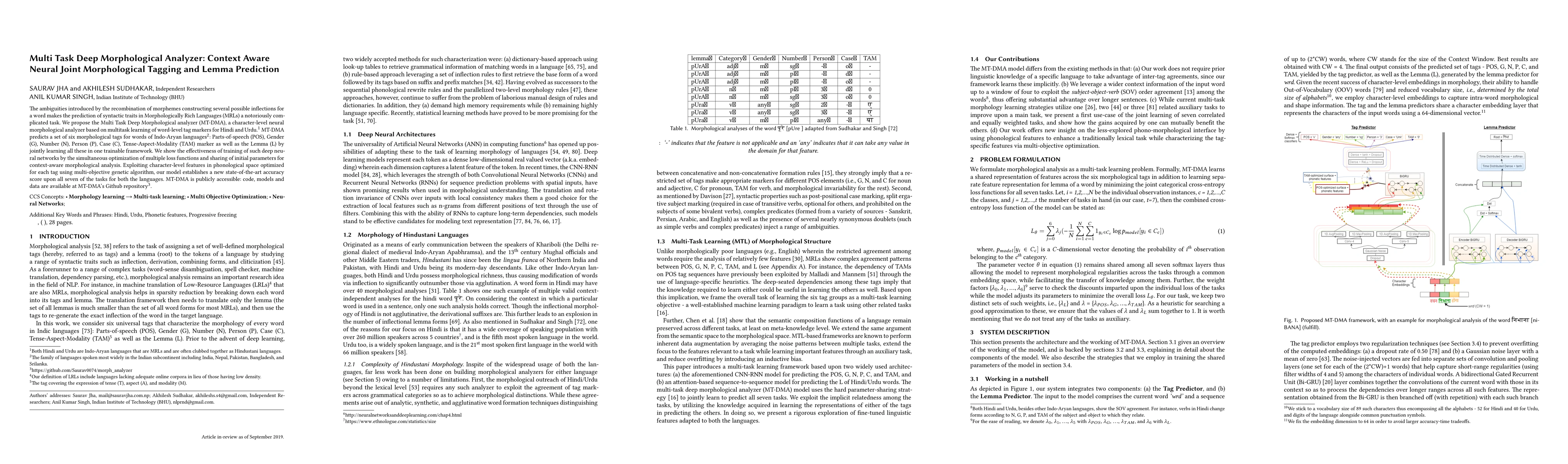 The paper introduces the Multi Task Deep Morphological Analyzer (MT-DMA), a character-level neural network for joint morphological tagging and lemma prediction in Hindi and Urdu. It achieves state-of-the-art performance by optimizing multiple loss functions and sharing parameters for context-aware analysis.