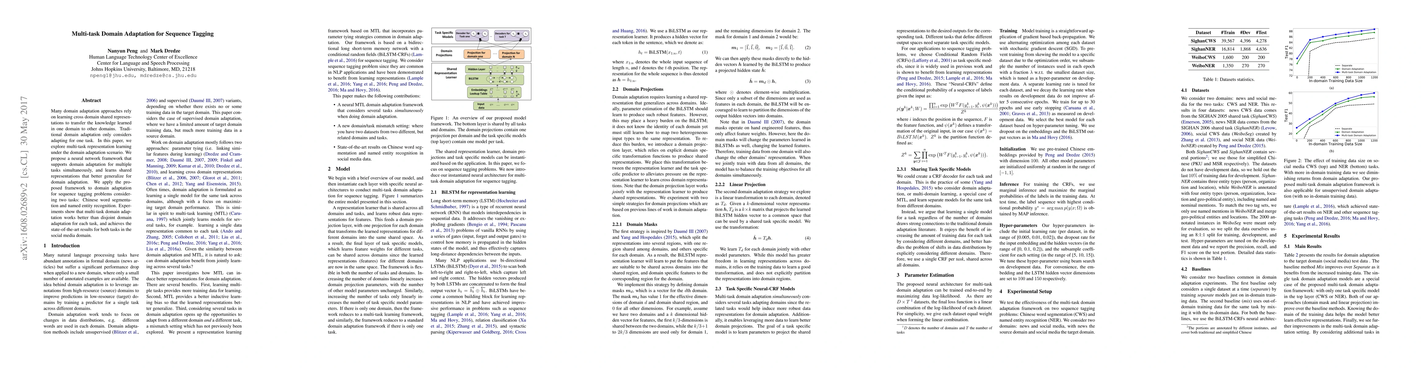 This paper proposes a neural network framework for multi-task domain adaptation to improve sequence tagging across different domains. It demonstrates superior performance compared to single-task adaptation, achieving state-of-the-art results for Chinese word segmentation and named entity recognition in social media.