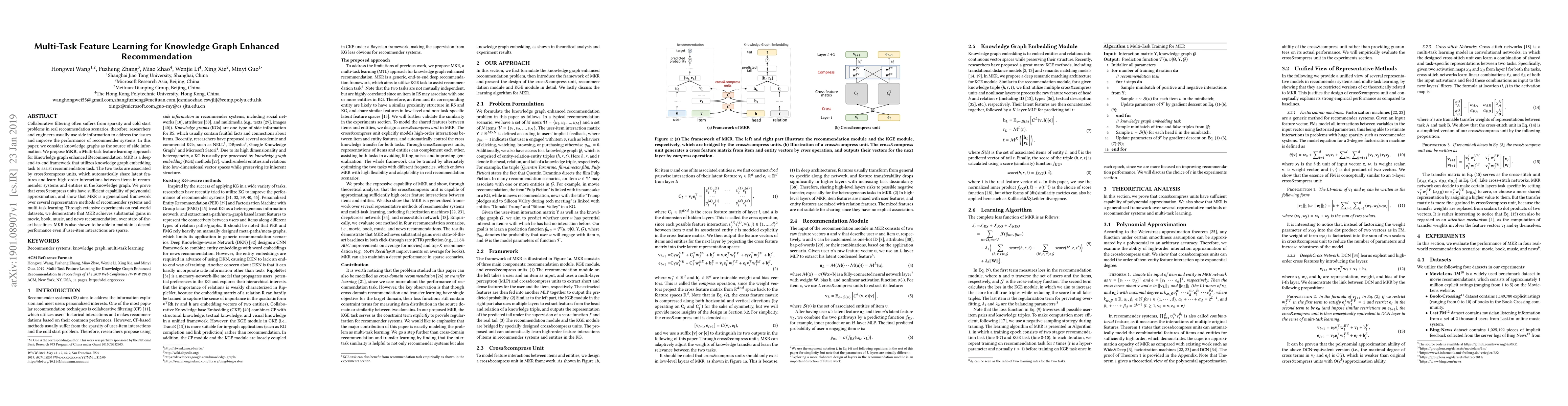 This paper proposes MKR, a Multi-task feature learning approach for Knowledge graph enhanced Recommendation, which uses knowledge graphs to address sparsity and cold start issues in recommender systems. MKR leverages cross&compress units to share latent features and learn high-order interactions, achieving substantial improvements over state-of-the-art methods in various recommendation tasks.