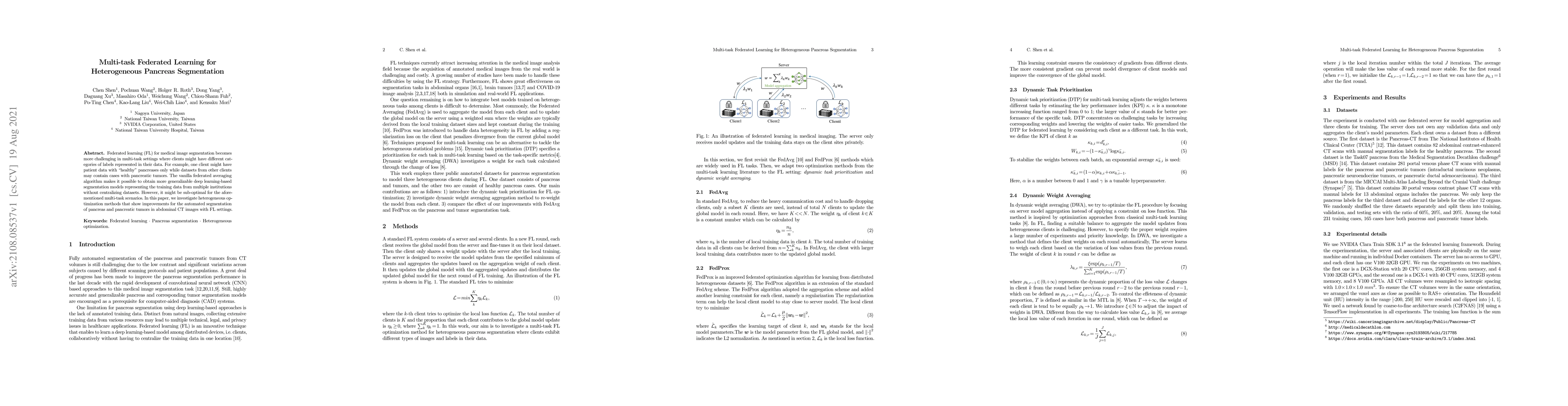Federated learning (FL) for medical image segmentation becomes more challenging in multi-task settings where clients might have different categories of labels represented in their data. For example, one client might have patient data with "healthy'' pancreases only while datasets from other clients may contain cases with pancreatic tumors. The vanilla federated averaging algorithm makes it possible to obtain more generalizable deep learning-based segmentation models representing the training data from multiple institutions without centralizing datasets. However, it might be sub-optimal for the aforementioned multi-task scenarios. In this paper, we investigate heterogeneous optimization methods that show improvements for the automated segmentation of pancreas and pancreatic tumors in abdominal CT images with FL settings.