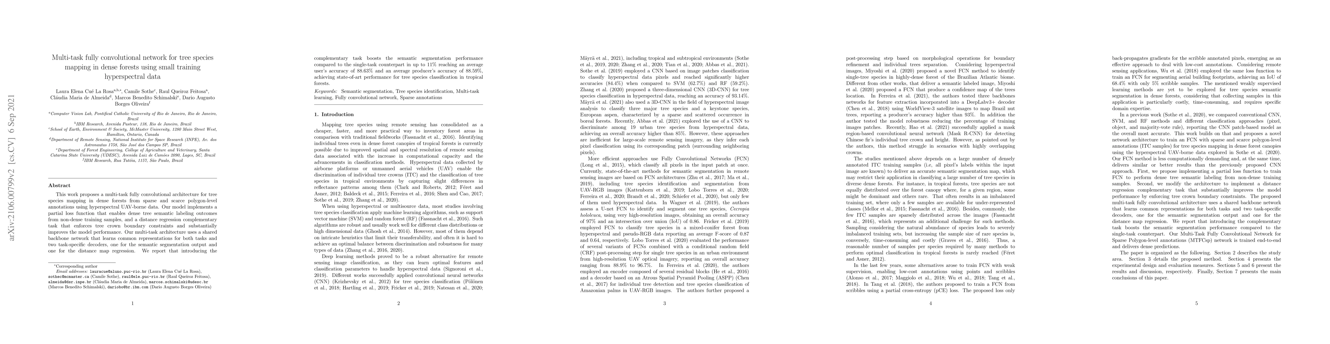 This work proposes a multi-task fully convolutional architecture for tree species mapping in dense forests from sparse and scarce polygon-level annotations using hyperspectral UAV-borne data. Our model implements a partial loss function that enables dense tree semantic labeling outcomes from non-dense training samples, and a distance regression complementary task that enforces tree crown boundary constraints and substantially improves the model performance. Our multi-task architecture uses a shared backbone network that learns common representations for both tasks and two task-specific decoders, one for the semantic segmentation output and one for the distance map regression. We report that introducing the complementary task boosts the semantic segmentation performance compared to the single-task counterpart in up to 11% reaching an average user's accuracy of 88.63% and an average producer's accuracy of 88.59%, achieving state-of-art performance for tree species classification in tropical forests.