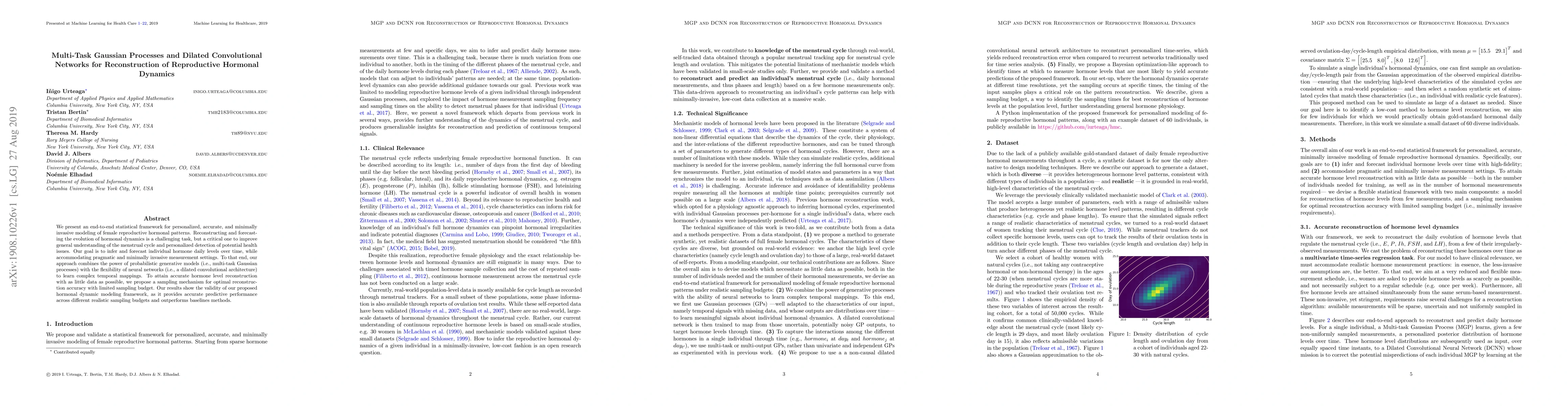 We present an end-to-end statistical framework for personalized, accurate, and minimally invasive modeling of female reproductive hormonal patterns. Reconstructing and forecasting the evolution of hormonal dynamics is a challenging task, but a critical one to improve general understanding of the menstrual cycle and personalized detection of potential health issues. Our goal is to infer and forecast individual hormone daily levels over time, while accommodating pragmatic and minimally invasive measurement settings. To that end, our approach combines the power of probabilistic generative models (i.e., multi-task Gaussian processes) with the flexibility of neural networks (i.e., a dilated convolutional architecture) to learn complex temporal mappings. To attain accurate hormone level reconstruction with as little data as possible, we propose a sampling mechanism for optimal reconstruction accuracy with limited sampling budget. Our results show the validity of our proposed hormonal dynamic modeling framework, as it provides accurate predictive performance across different realistic sampling budgets and outperforms baselines methods.