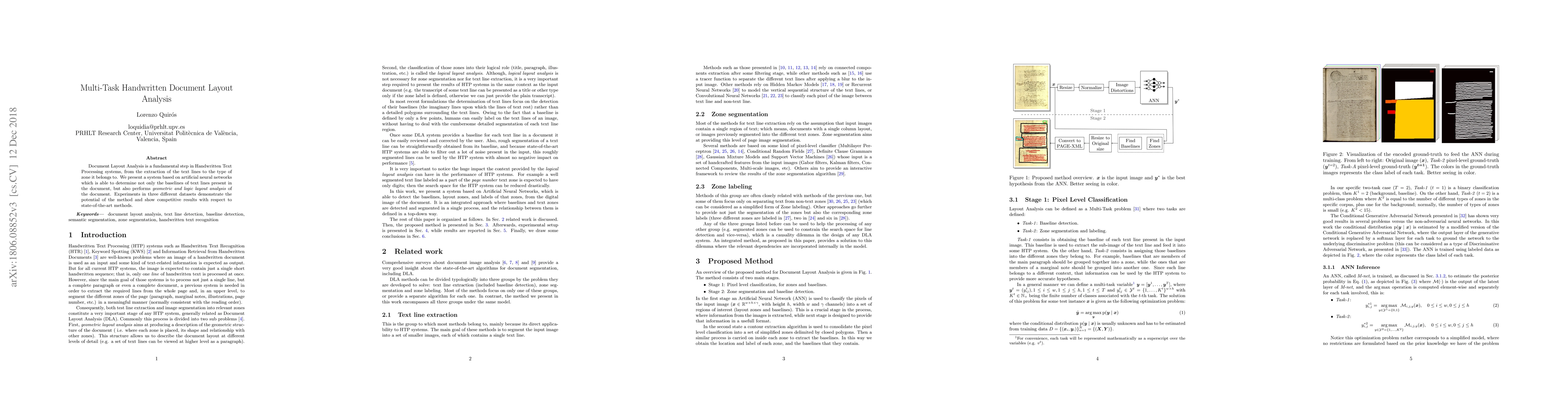 This paper introduces an artificial neural network system for multi-task handwritten document layout analysis, capable of determining text line baselines and performing comprehensive geometric and logical layout analysis. Experiments across three datasets show competitive results against state-of-the-art methods.