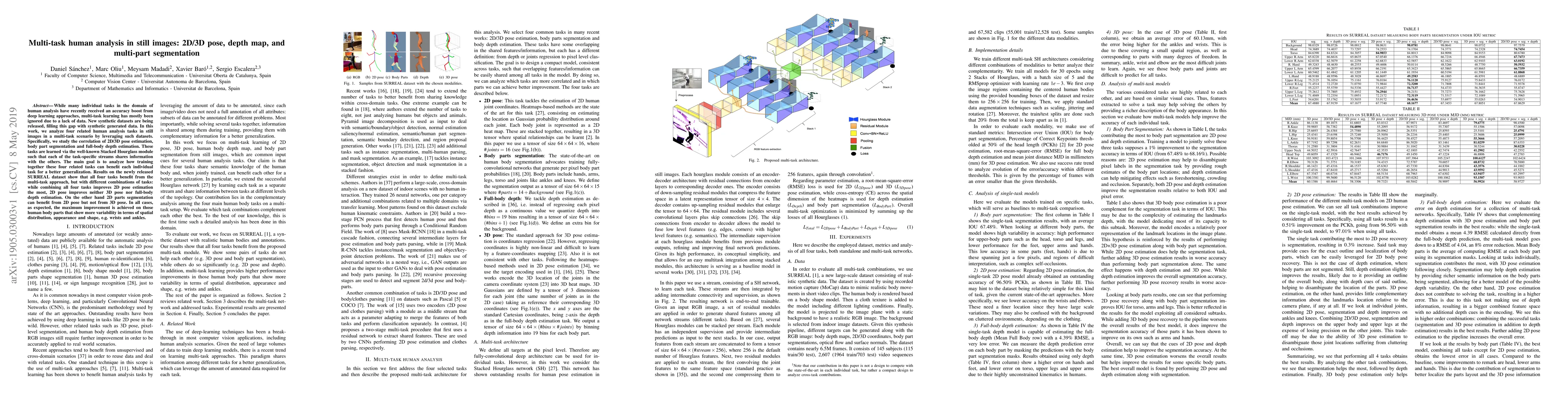 This paper explores multi-task learning for four human analysis tasks—2D/3D pose estimation, body part segmentation, and depth map estimation—using synthetic datasets. The study finds that training these tasks together, via the Stacked Hourglass module, improves individual task performance, with the most significant gains in 2D pose estimation when all tasks are combined.
