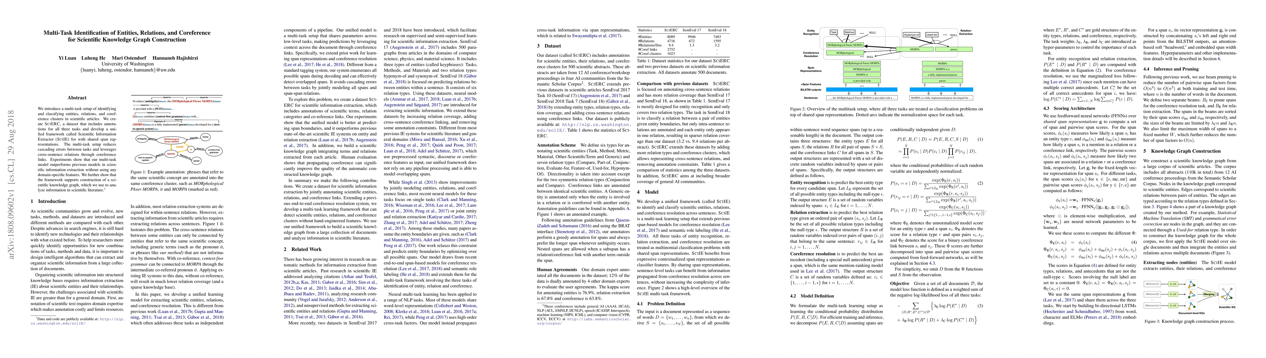 Summary: This paper presents SciERC, a dataset for multi-task identification of entities, relations, and coreferences in scientific articles, and introduces SciIE, a unified framework that outperforms previous models through shared span representations, demonstrating effective scientific knowledge graph construction.