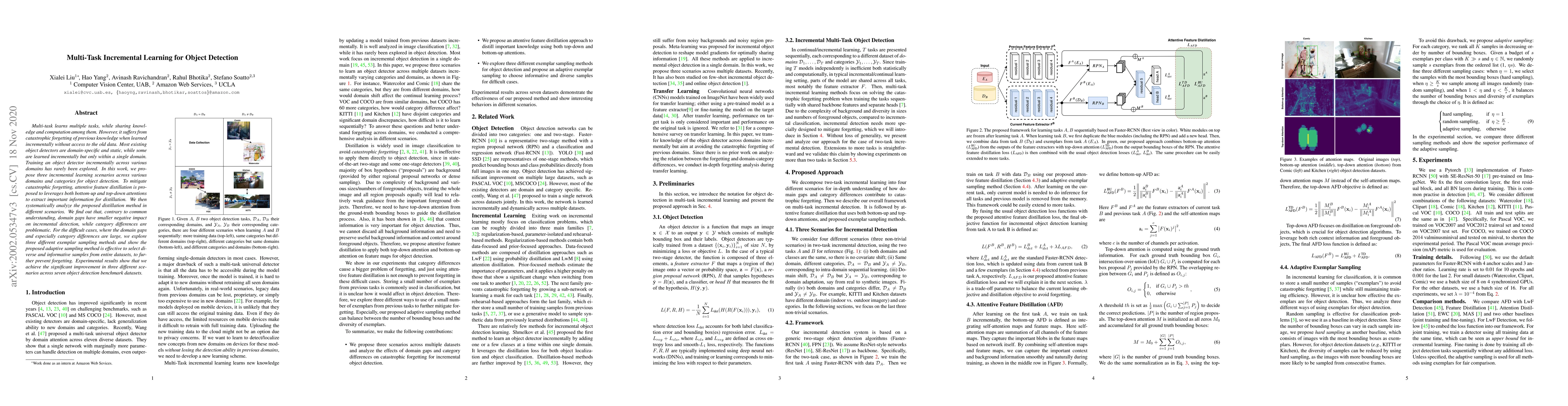 This paper proposes methods for multi-task incremental learning to improve object detection across various domains and categories, addressing catastrophic forgetting through attentive feature distillation and adaptive sampling. Experimental results demonstrate significant improvements in performance across seven benchmark datasets.