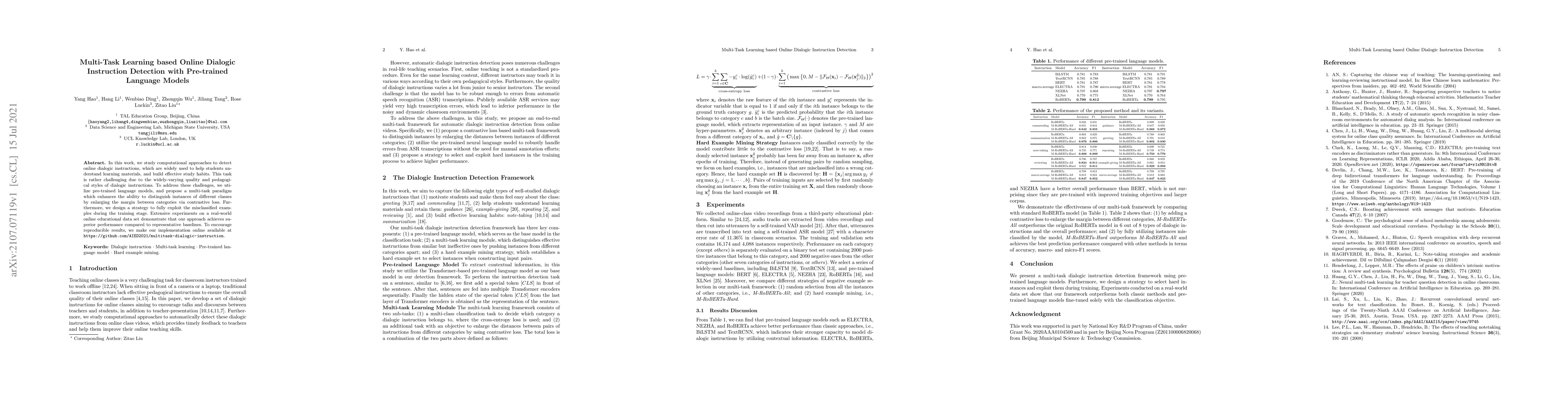 In this work, we study computational approaches to detect online dialogic instructions, which are widely used to help students understand learning materials, and build effective study habits. This task is rather challenging due to the widely-varying quality and pedagogical styles of dialogic instructions. To address these challenges, we utilize pre-trained language models, and propose a multi-task paradigm which enhances the ability to distinguish instances of different classes by enlarging the margin between categories via contrastive loss. Furthermore, we design a strategy to fully exploit the misclassified examples during the training stage. Extensive experiments on a real-world online educational data set demonstrate that our approach achieves superior performance compared to representative baselines. To encourage reproducible results, we make our implementation online available at \url{https://github.com/AIED2021/multitask-dialogic-instruction}.