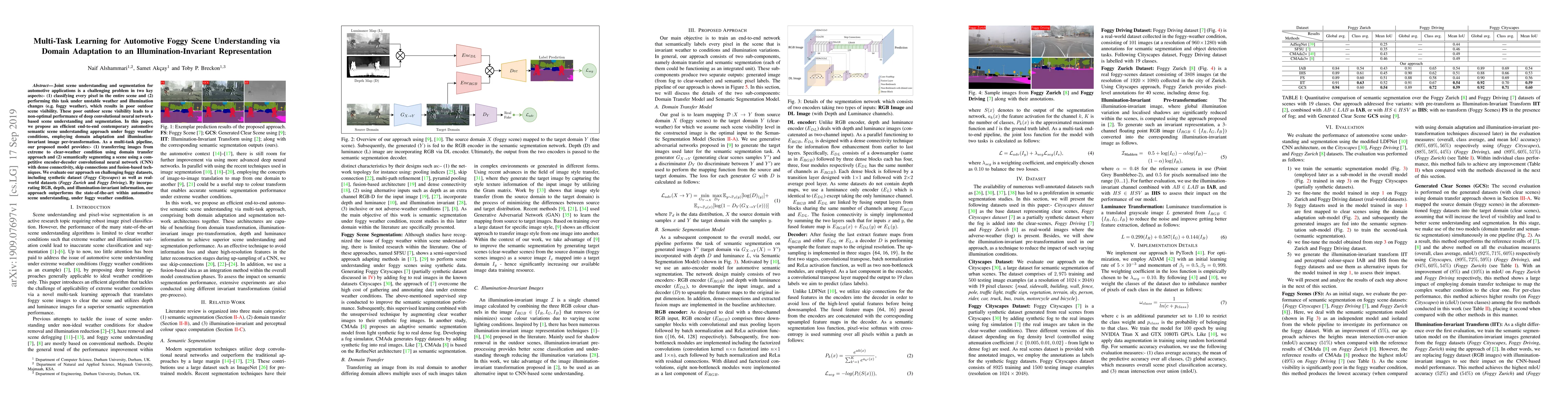 This paper proposes an end-to-end multi-task learning model for automotive scene understanding under foggy conditions, utilizing domain adaptation and illumination-invariant transformations. The model effectively transfers foggy images to clear conditions and segments scenes using a CNN with dense and skip connections, outperforming state-of-the-art methods on foggy datasets.