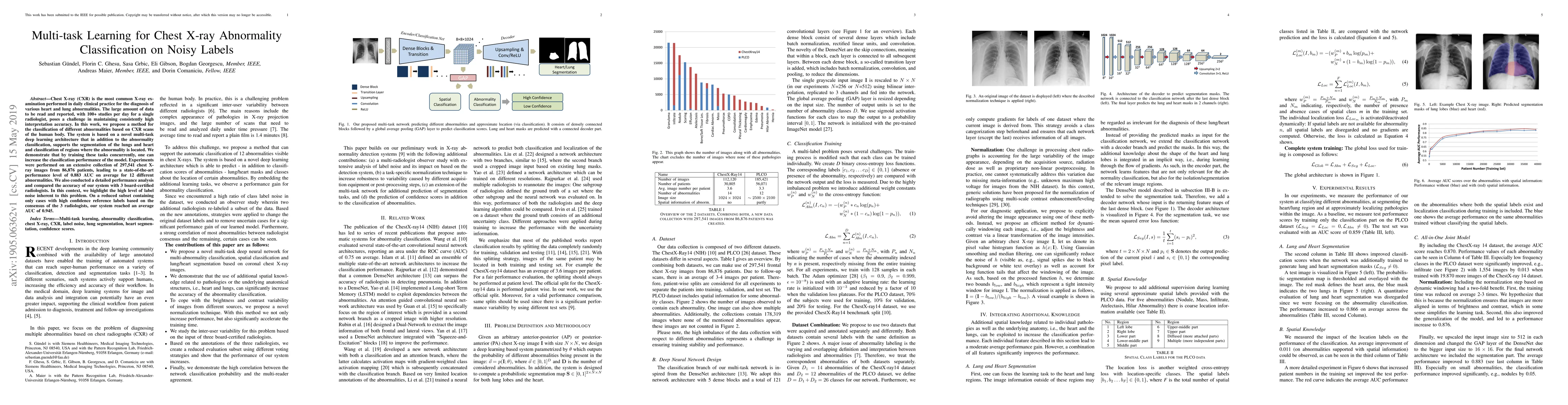 This research proposes a multi-task deep learning model for classifying chest X-ray abnormalities, incorporating lung and heart segmentation, and region-based classification. The model achieves state-of-the-art performance with an average AUC of 0.883 on 297,541 images, demonstrating improved accuracy through concurrent training of multiple tasks.