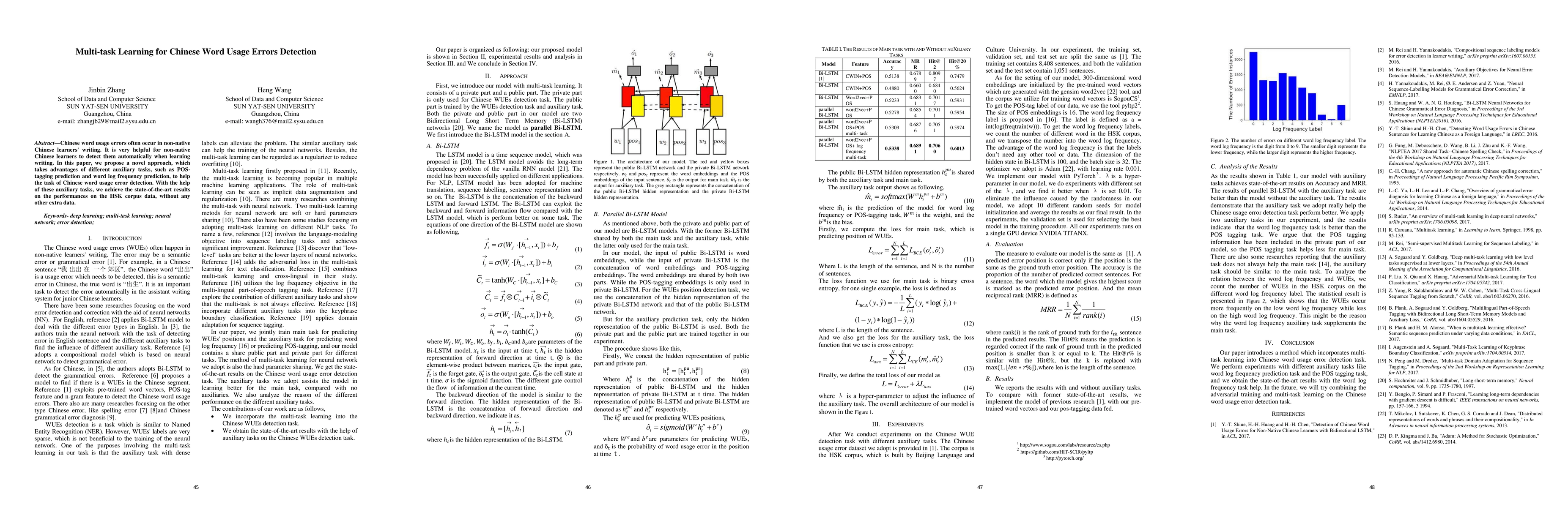This paper proposes a novel approach to detecting Chinese word usage errors in non-native writers using auxiliary tasks like POS-tagging and word frequency prediction. It achieves state-of-the-art results on the HSK corpus data without requiring extra data.