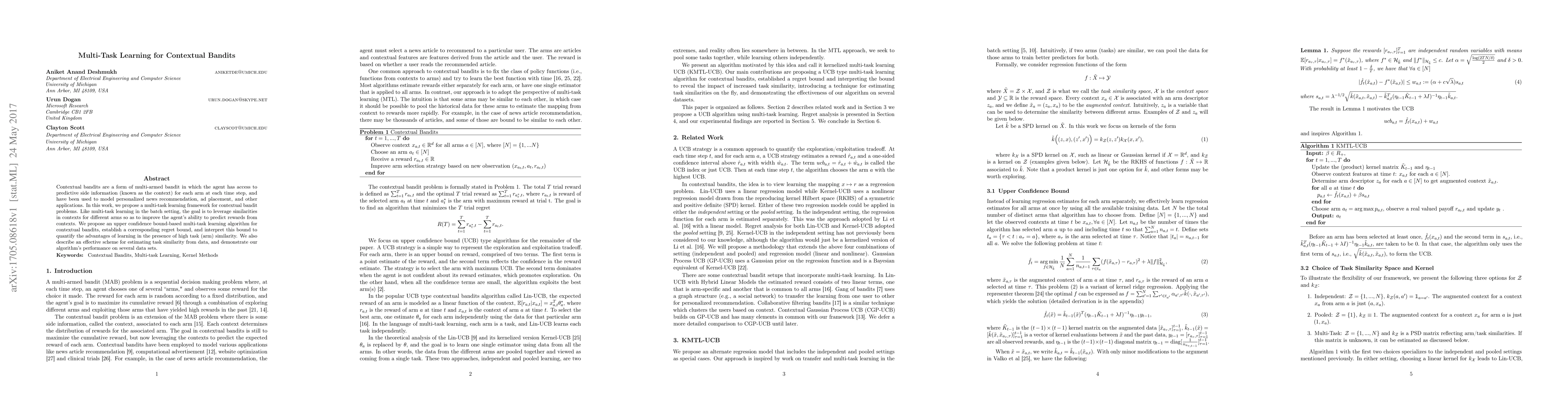 This paper proposes a multi-task learning framework for contextual bandit problems, leveraging similarities across contexts to improve reward prediction. It introduces an upper confidence bound-based algorithm, establishes a regret bound, and demonstrates its effectiveness on various datasets.