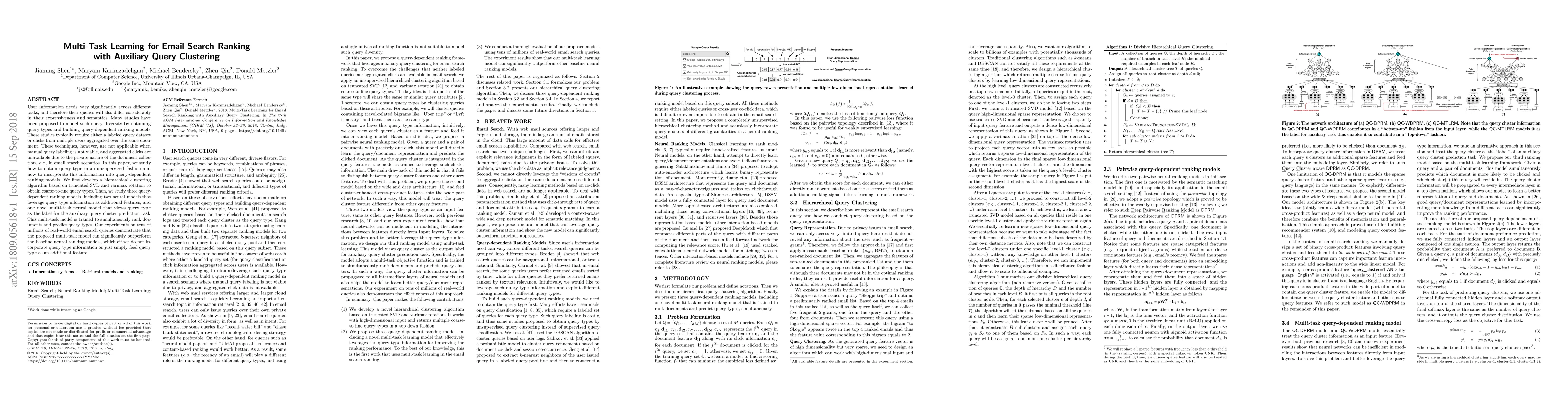 This paper proposes an unsupervised method for obtaining query types in email search scenarios and incorporates this information into query-dependent ranking models. The authors develop a hierarchical clustering algorithm and introduce a multi-task neural model that simultaneously ranks documents and predicts query types, achieving superior performance over baseline models.