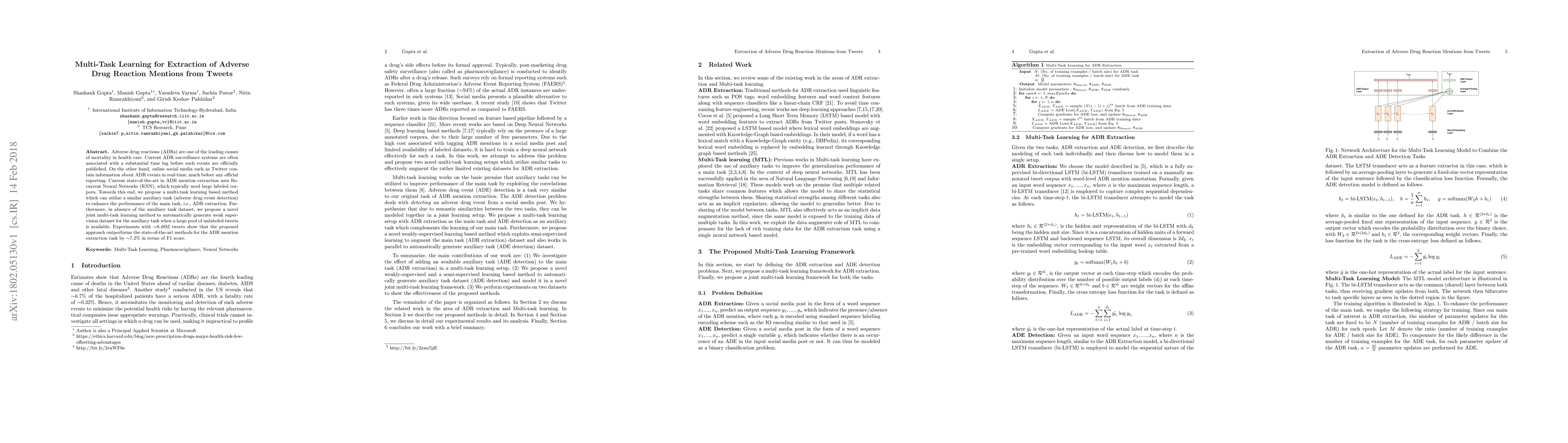 This paper proposes a multi-task learning approach to enhance the extraction of adverse drug reaction mentions from real-time Twitter data, leveraging auxiliary adverse drug event detection tasks. The method outperforms existing RNN-based methods, achieving a 7.2% improvement in F1 score on 0.48M tweets.