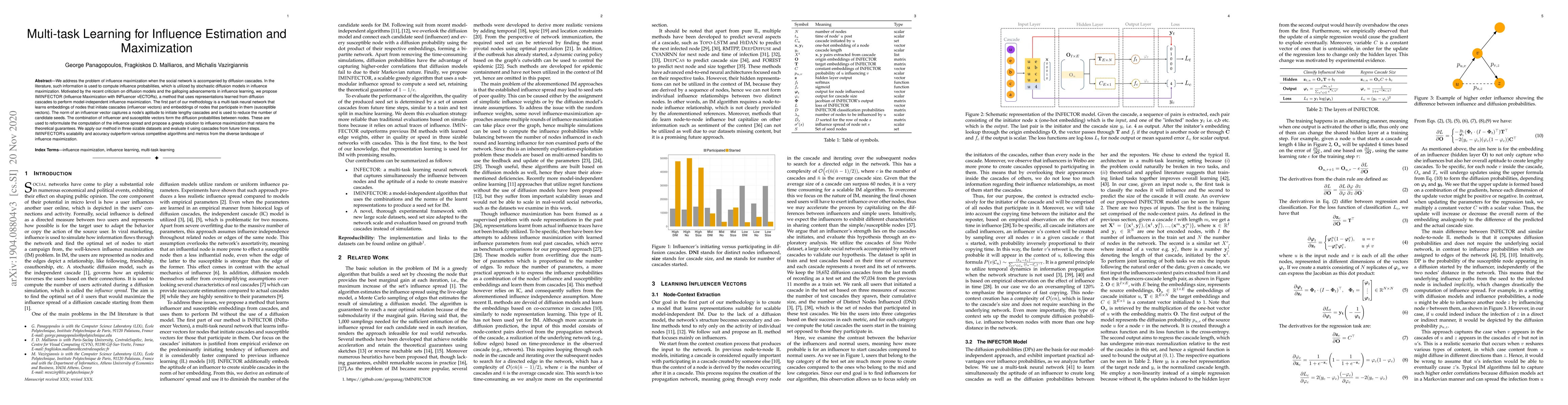 This paper proposes IMINFECTOR, a multi-task learning approach for influence maximization in social networks with diffusion cascades, using learned representations to estimate influence spread and reduce candidate seeds. The method outperforms existing algorithms in efficiency and seed set quality across large networks.