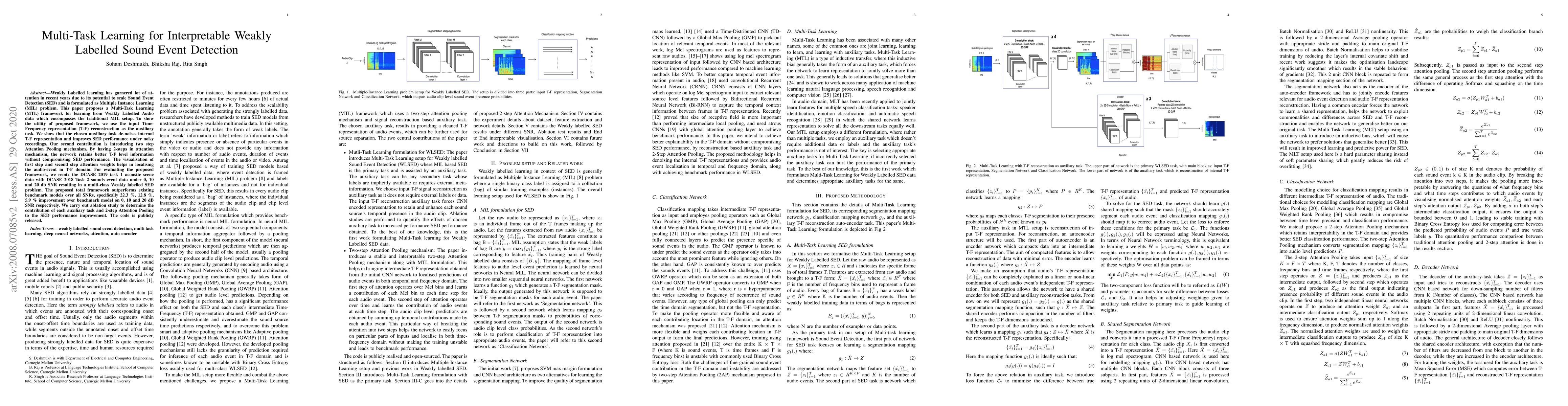Weakly Labelled learning has garnered lot of attention in recent years due to its potential to scale Sound Event Detection (SED) and is formulated as Multiple Instance Learning (MIL) problem. This paper proposes a Multi-Task Learning (MTL) framework for learning from Weakly Labelled Audio data which encompasses the traditional MIL setup. To show the utility of proposed framework, we use the input TimeFrequency representation (T-F) reconstruction as the auxiliary task. We show that the chosen auxiliary task de-noises internal T-F representation and improves SED performance under noisy recordings. Our second contribution is introducing two step Attention Pooling mechanism. By having 2-steps in attention mechanism, the network retains better T-F level information without compromising SED performance. The visualisation of first step and second step attention weights helps in localising the audio-event in T-F domain. For evaluating the proposed framework, we remix the DCASE 2019 task 1 acoustic scene data with DCASE 2018 Task 2 sounds event data under 0, 10 and 20 db SNR resulting in a multi-class Weakly labelled SED problem. The proposed total framework outperforms existing benchmark models over all SNRs, specifically 22.3 %, 12.8 %, 5.9 % improvement over benchmark model on 0, 10 and 20 dB SNR respectively. We carry out ablation study to determine the contribution of each auxiliary task and 2-step Attention Pooling to the SED performance improvement. The code is publicly released