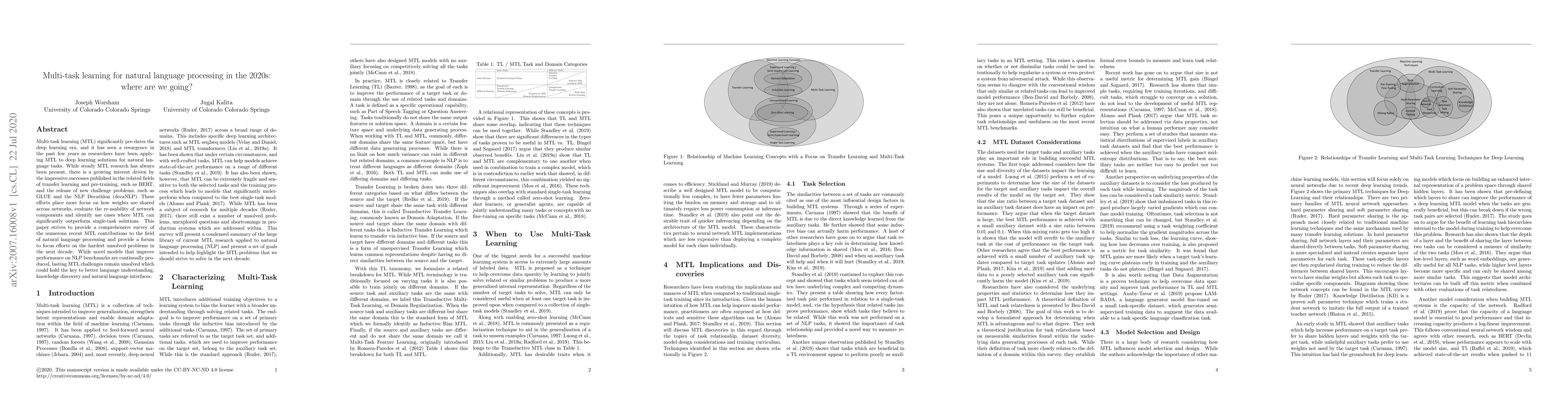 This paper surveys recent advancements in multi-task learning (MTL) for natural language processing, highlighting its resurgence due to successes in transfer learning and pre-training. It aims to identify unsolved challenges and potential future directions for MTL research in NLP.
