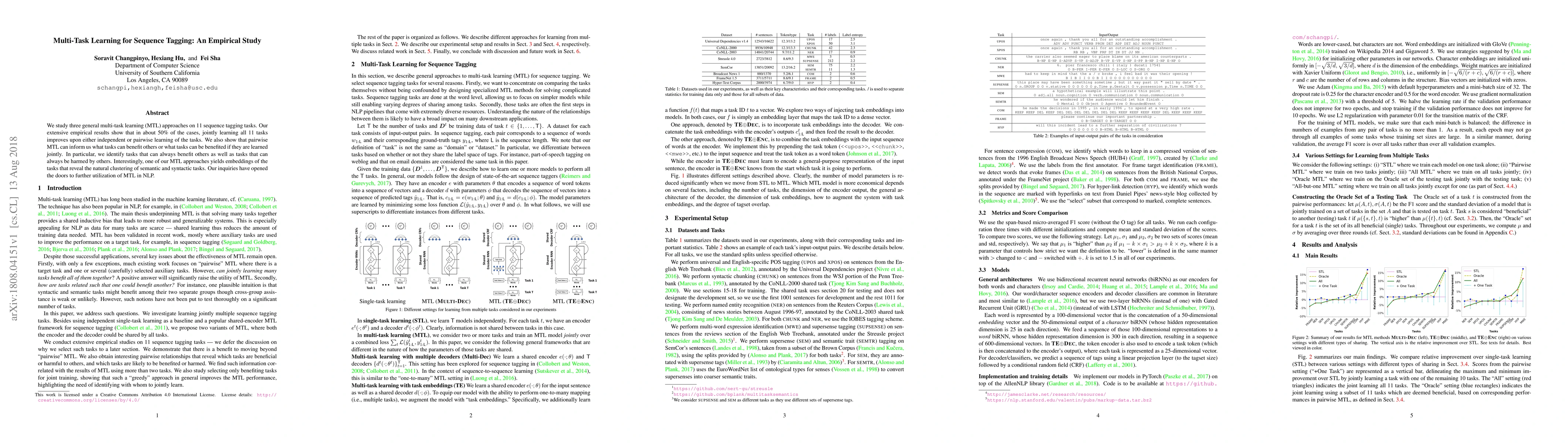 We study three general multi-task learning (MTL) approaches on 11 sequence tagging tasks. Our extensive empirical results show that in about 50% of the cases, jointly learning all 11 tasks improves upon either independent or pairwise learning of the tasks. We also show that pairwise MTL can inform us what tasks can benefit others or what tasks can be benefited if they are learned jointly. In particular, we identify tasks that can always benefit others as well as tasks that can always be harmed by others. Interestingly, one of our MTL approaches yields embeddings of the tasks that reveal the natural clustering of semantic and syntactic tasks. Our inquiries have opened the doors to further utilization of MTL in NLP.