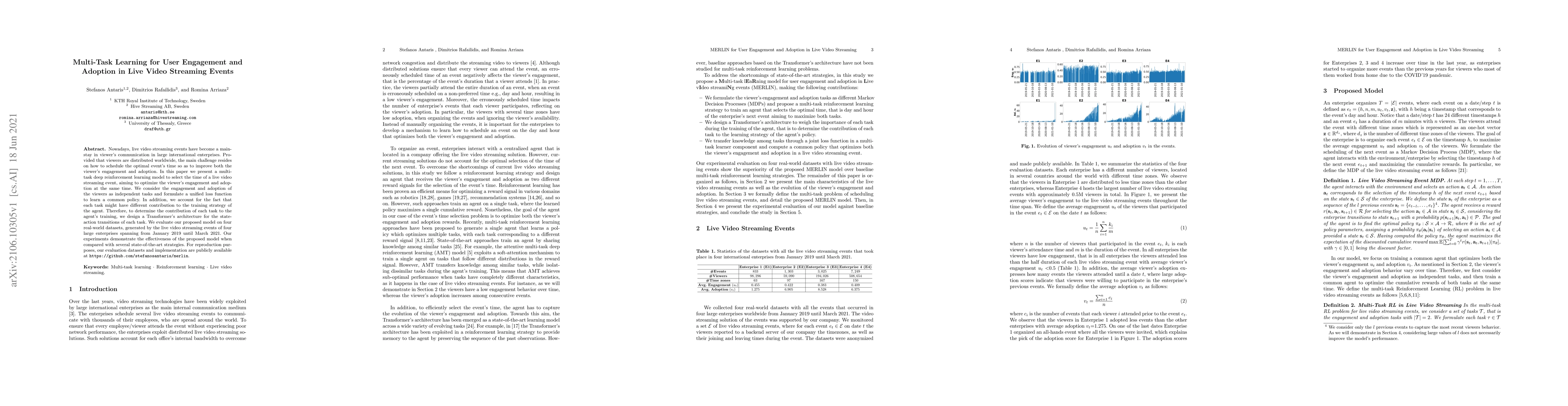 Nowadays, live video streaming events have become a mainstay in viewer's communication in large international enterprises. Provided that viewers are distributed worldwide, the main challenge resides on how to schedule the optimal event's time so as to improve both the viewer's engagement and adoption. In this paper we present a multi-task deep reinforcement learning model to select the time of a live video streaming event, aiming to optimize the viewer's engagement and adoption at the same time. We consider the engagement and adoption of the viewers as independent tasks and formulate a unified loss function to learn a common policy. In addition, we account for the fact that each task might have different contribution to the training strategy of the agent. Therefore, to determine the contribution of each task to the agent's training, we design a Transformer's architecture for the state-action transitions of each task. We evaluate our proposed model on four real-world datasets, generated by the live video streaming events of four large enterprises spanning from January 2019 until March 2021. Our experiments demonstrate the effectiveness of the proposed model when compared with several state-of-the-art strategies. For reproduction purposes, our evaluation datasets and implementation are publicly available at https://github.com/stefanosantaris/merlin.