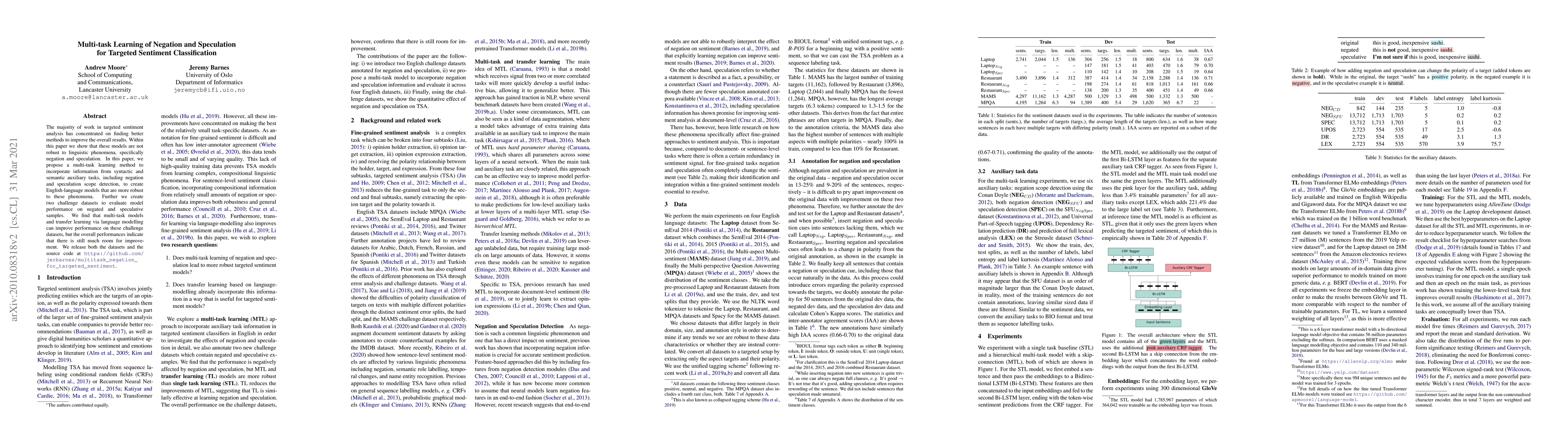 This paper proposes a multi-task learning approach to enhance targeted sentiment classification by incorporating negation and speculation detection, addressing the lack of robustness in existing models to these linguistic phenomena. The study introduces new datasets for evaluation and finds that multi-task learning and transfer learning improve performance, though room for further enhancement remains.