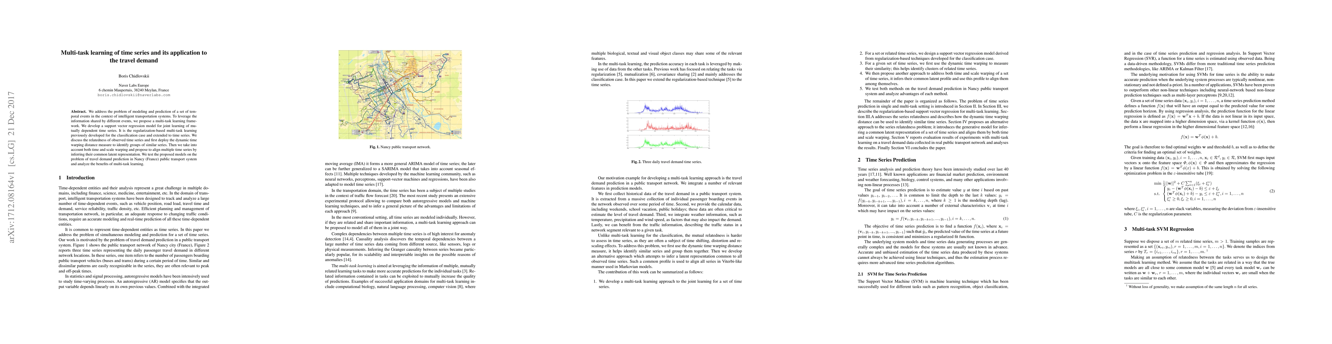 This paper proposes a multi-task learning framework for time series modeling and prediction, specifically applied to travel demand forecasting in the public transport system of Nancy, France. The approach leverages shared information across different time series using a support vector regression model and dynamic time warping to identify and align similar series, demonstrating the benefits of multi-task learning in the context of travel demand prediction.