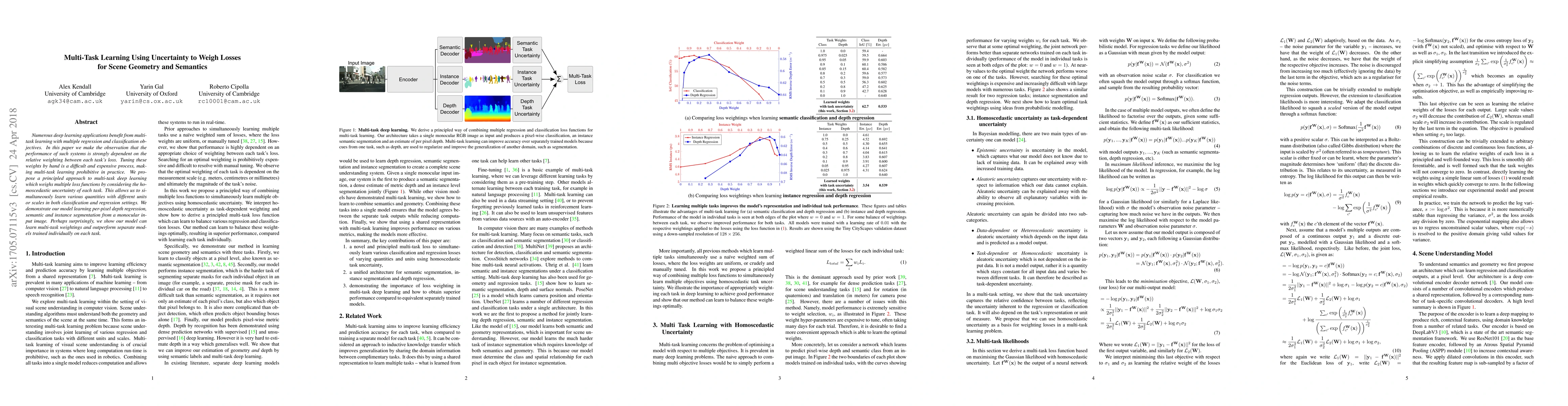 This paper proposes a method for multi-task learning that dynamically weighs loss functions based on task-specific uncertainty, enabling the simultaneous learning of diverse objectives. The approach outperforms separate models trained individually, demonstrating its effectiveness in tasks like depth regression, semantic, and instance segmentation.