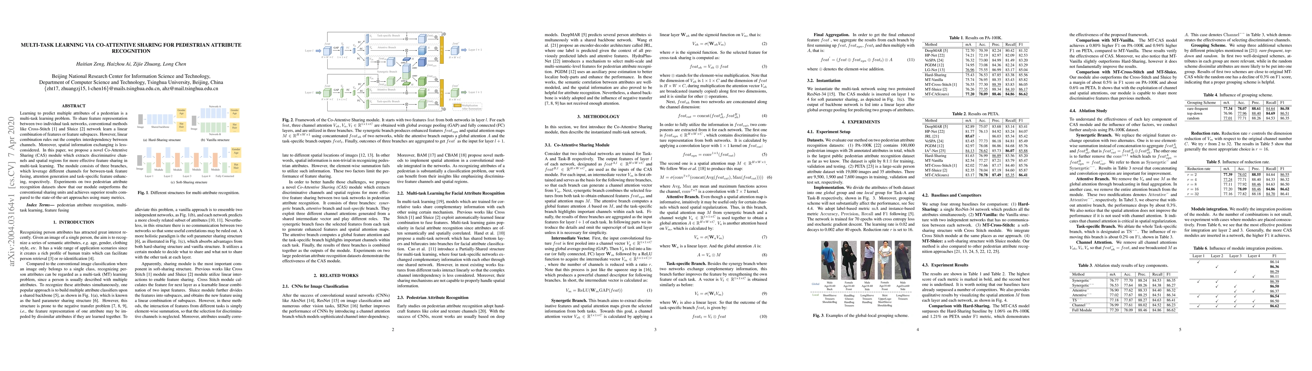 This paper introduces a Co-Attentive Sharing (CAS) module for multi-task learning in pedestrian attribute recognition, which extracts discriminative channels and spatial regions for effective feature sharing. The CAS module outperforms conventional methods by leveraging attention generation and task-specific feature enhancement, achieving superior results on pedestrian datasets.