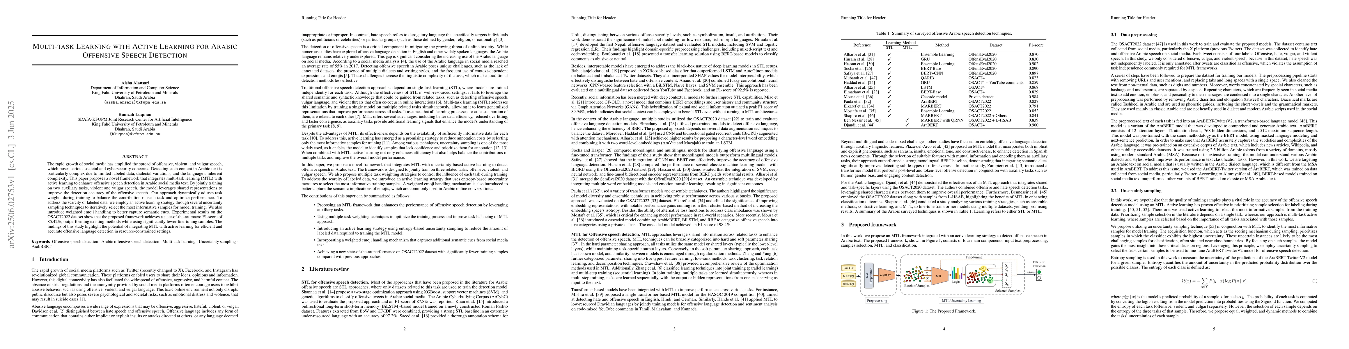 A novel framework integrates multi-task learning with active learning to detect offensive speech in Arabic social media text, achieving a state-of-the-art macro F1-score of 85.42%.