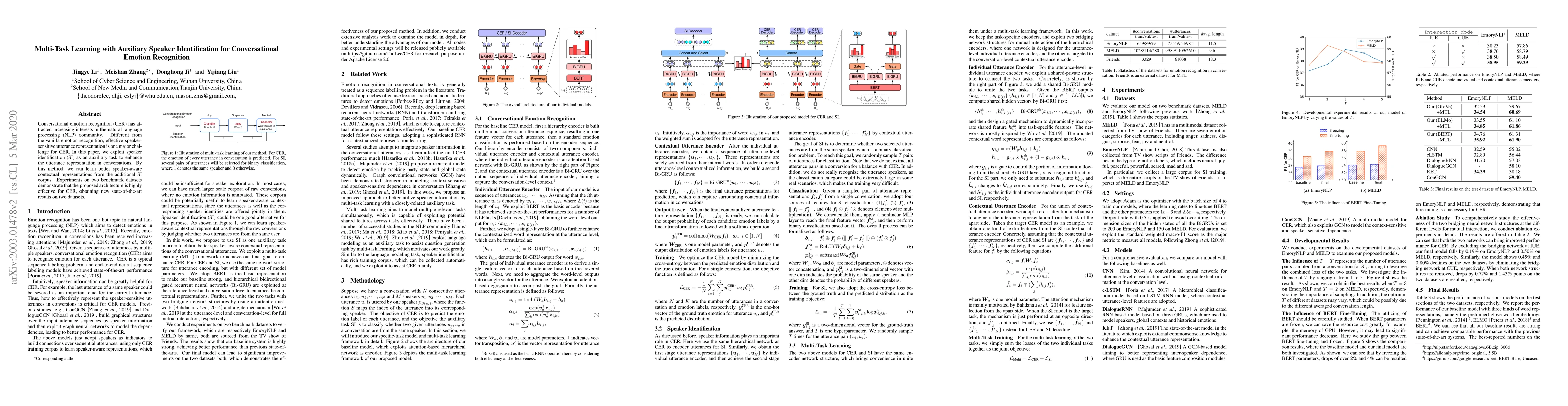 The paper proposes a multi-task learning architecture for conversational emotion recognition (CER) that leverages speaker identification (SI) as an auxiliary task. It employs a hierarchical encoder with an individual utterance encoder (based on BERT) and a contextual utterance encoder (BiGRU), followed by a shared-private structure for mutual interaction between tasks. Cross-attention is used to augment utterance representation from the SI side.