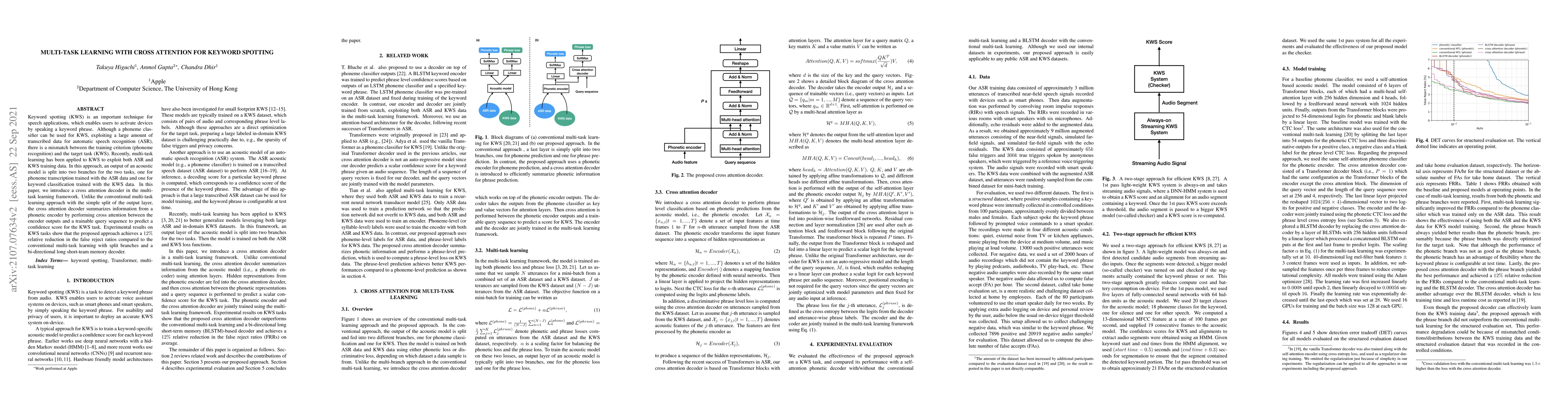 This paper proposes a cross attention decoder for multi-task learning in keyword spotting, achieving a 12% relative reduction in false reject ratios compared to conventional methods by better utilizing ASR and KWS data.