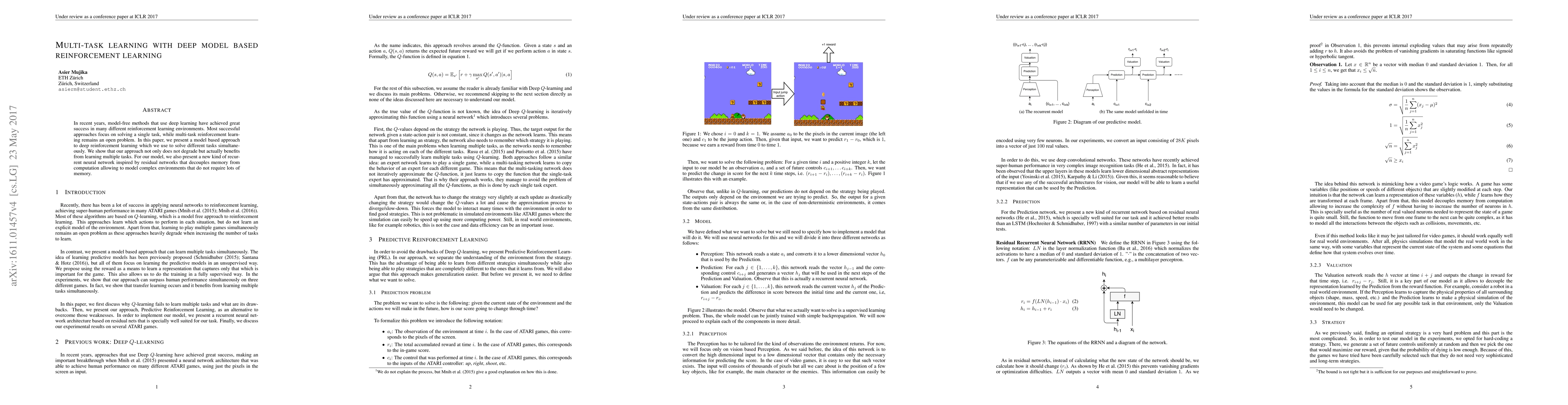 This paper introduces a model-based deep reinforcement learning approach for multi-task learning, demonstrating that it can solve various tasks simultaneously without performance degradation and can even benefit from it. The authors employ a novel recurrent neural network inspired by residual networks to decouple memory from computation for complex environments.