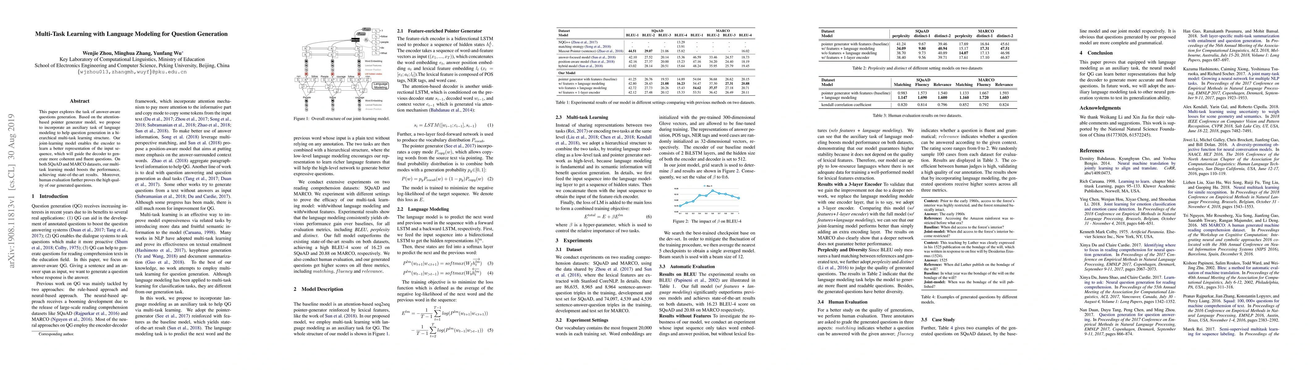 This paper proposes a multi-task learning approach combining language modeling with an attention-based pointer generator for answer-aware question generation. The model improves question coherence and fluency, achieving state-of-the-art results on SQuAD and MARCO datasets, with high-quality questions confirmed by human evaluation.