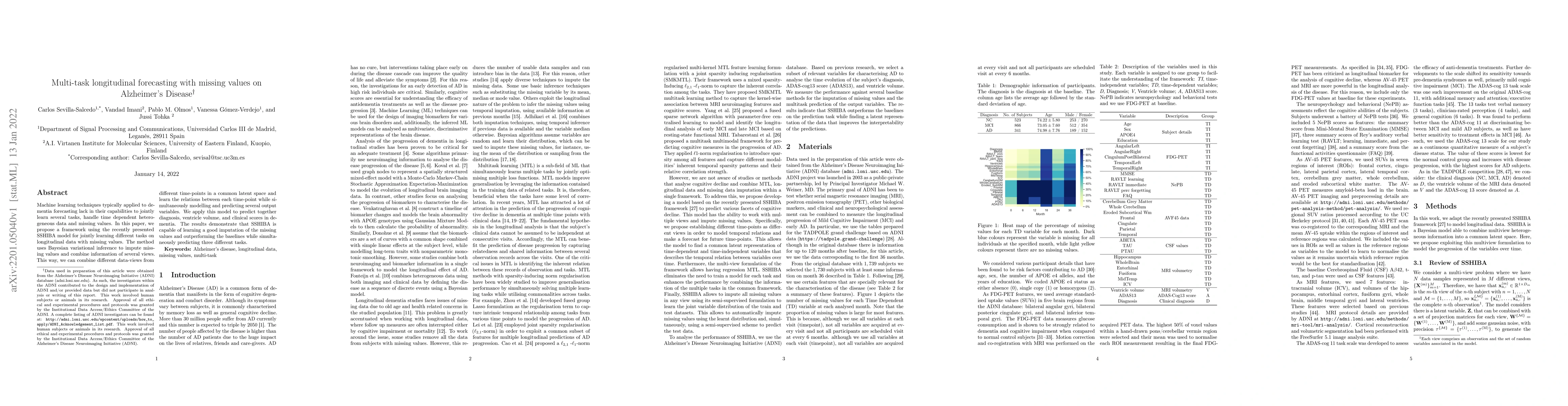 This paper proposes a multi-task SSHIBA model for longitudinal forecasting in Alzheimer's Disease, addressing missing values and time-dependent heterogeneity. The framework uses Bayesian variational inference to impute missing data and predict diagnosis, ventricle volume, and clinical scores, outperforming baseline methods.