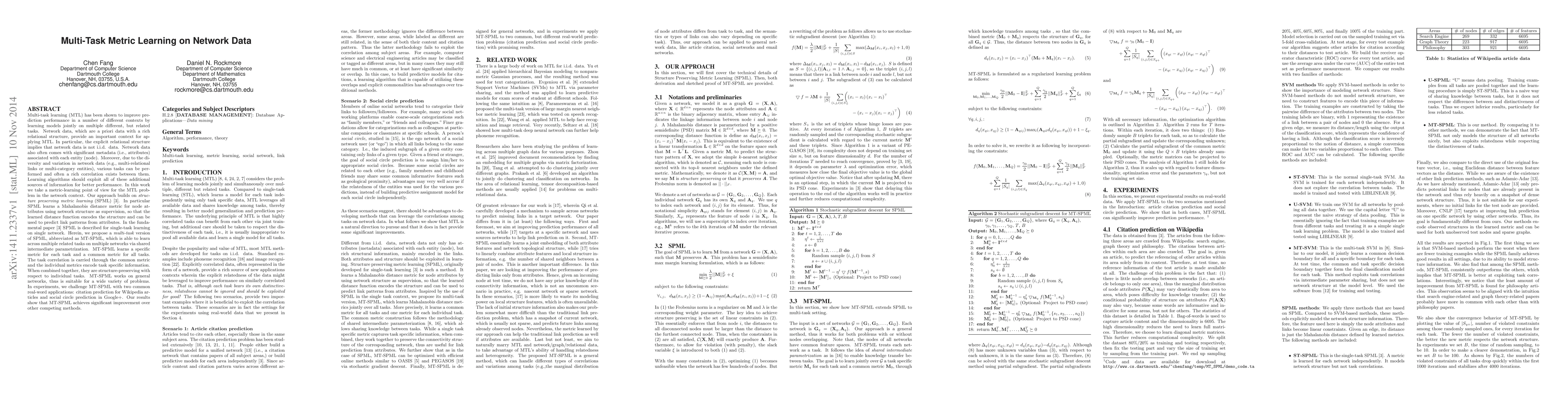 This paper proposes a multi-task metric learning approach, MT-SPML, for network data, leveraging structure-preserving metric learning to improve performance across multiple related tasks. MT-SPML learns both task-specific and a shared metric, achieving better performance on real-world network data problems.