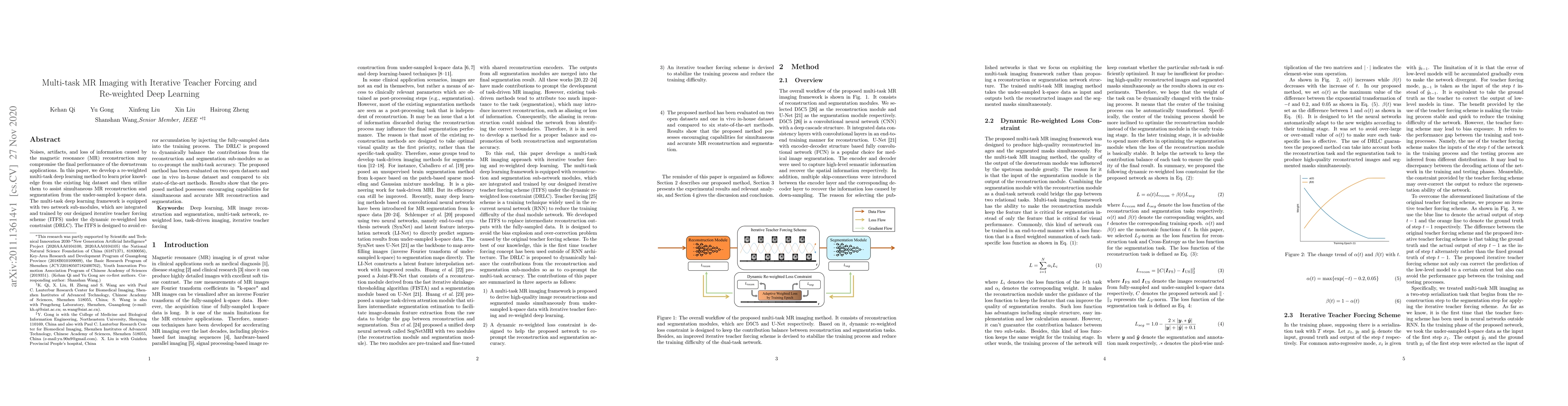 This paper proposes a multi-task deep learning method with iterative teacher forcing and re-weighted loss to simultaneously reconstruct and segment MR images from under-sampled k-space data. The method effectively balances reconstruction and segmentation tasks, demonstrating superior performance compared to six state-of-the-art methods.