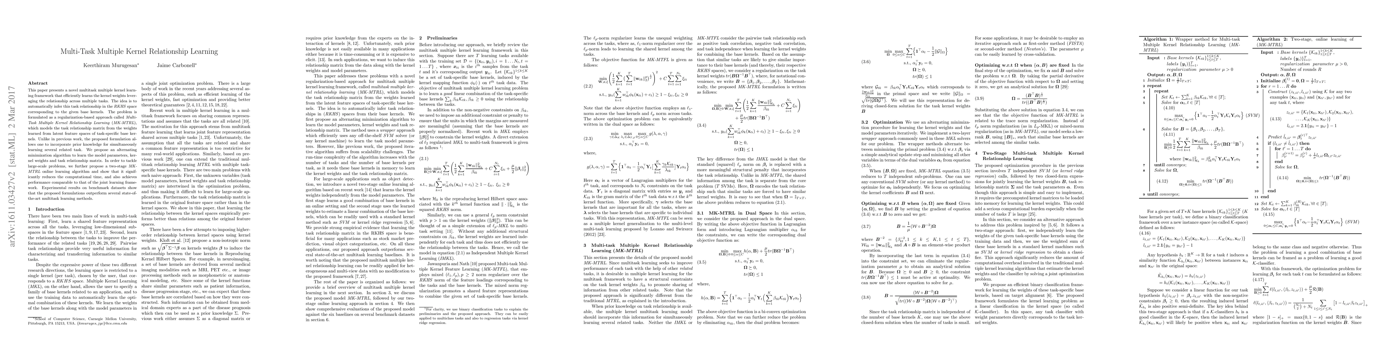 This paper introduces a novel multitask multiple kernel learning framework called MK-MTRL that efficiently learns kernel weights by inferring relationships across tasks in the RKHS space. It proposes an alternating minimization algorithm and an online learning approach to handle large-scale problems, achieving comparable performance with reduced computational time.