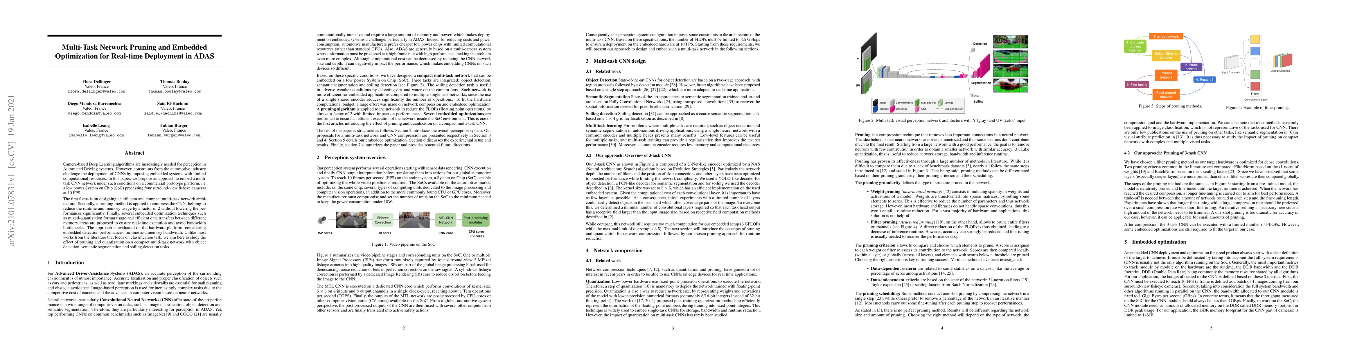 Camera-based Deep Learning algorithms are increasingly needed for perception in Automated Driving systems. However, constraints from the automotive industry challenge the deployment of CNNs by imposing embedded systems with limited computational resources. In this paper, we propose an approach to embed a multi-task CNN network under such conditions on a commercial prototype platform, i.e. a low power System on Chip (SoC) processing four surround-view fisheye cameras at 10 FPS. The first focus is on designing an efficient and compact multi-task network architecture. Secondly, a pruning method is applied to compress the CNN, helping to reduce the runtime and memory usage by a factor of 2 without lowering the performances significantly. Finally, several embedded optimization techniques such as mixed-quantization format usage and efficient data transfers between different memory areas are proposed to ensure real-time execution and avoid bandwidth bottlenecks. The approach is evaluated on the hardware platform, considering embedded detection performances, runtime and memory bandwidth. Unlike most works from the literature that focus on classification task, we aim here to study the effect of pruning and quantization on a compact multi-task network with object detection, semantic segmentation and soiling detection tasks.