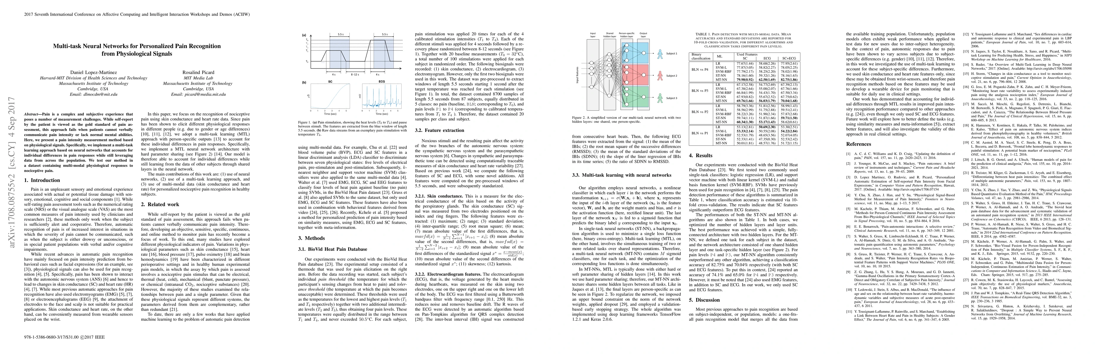 This paper proposes a multi-task neural network for personalized pain recognition using physiological signals, aiming to address the limitations of self-report methods. The method leverages data from a population to account for individual differences in pain responses.