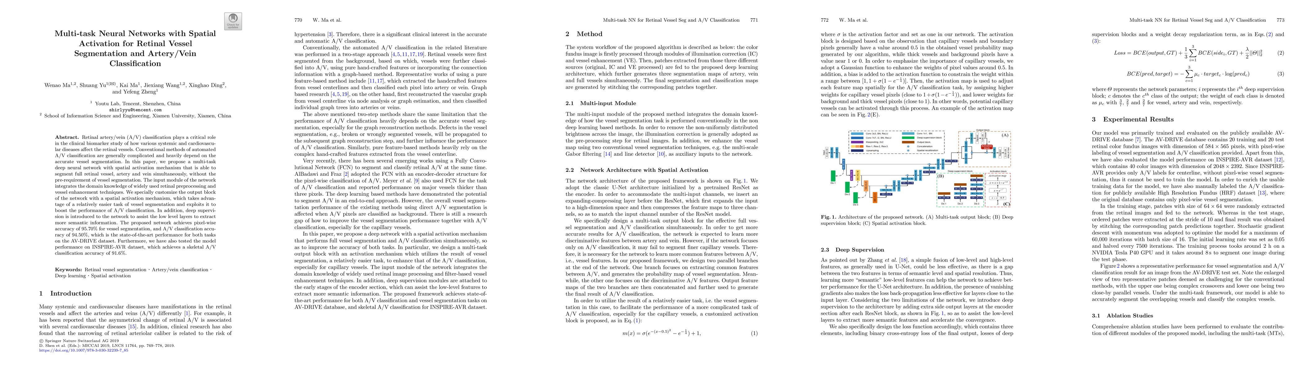 This paper proposes a multi-task neural network with spatial activation for simultaneous retinal vessel segmentation and artery/vein classification, achieving state-of-the-art accuracy without requiring pre-segmentation. The network integrates domain knowledge and uses deep supervision to enhance performance.