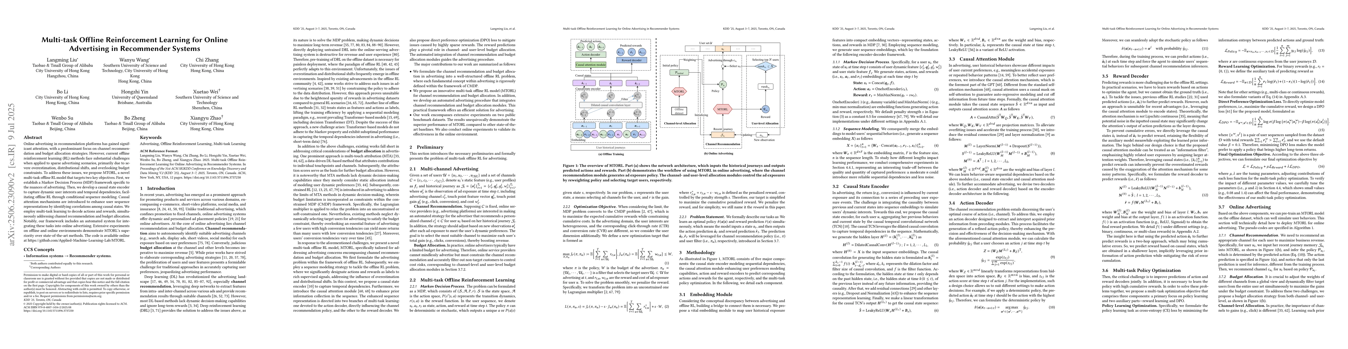 Online advertising in recommendation platforms has gained significant attention, with a predominant focus on channel recommendation and budget allocation strategies. However, current offline reinforcement learning (RL) methods face substantial challenges when applied to sparse advertising scenarios, primarily due to severe overestimation, distributional shifts, and overlooking budget constraints. To address these issues, we propose MTORL, a novel multi-task offline RL model that targets two key objectives. First, we establish a Markov Decision Process (MDP) framework specific to the nuances of advertising. Then, we develop a causal state encoder to capture dynamic user interests and temporal dependencies, facilitating offline RL through conditional sequence modeling. Causal attention mechanisms are introduced to enhance user sequence representations by identifying correlations among causal states. We employ multi-task learning to decode actions and rewards, simultaneously addressing channel recommendation and budget allocation. Notably, our framework includes an automated system for integrating these tasks into online advertising. Extensive experiments on offline and online environments demonstrate MTORL's superiority over state-of-the-art methods.