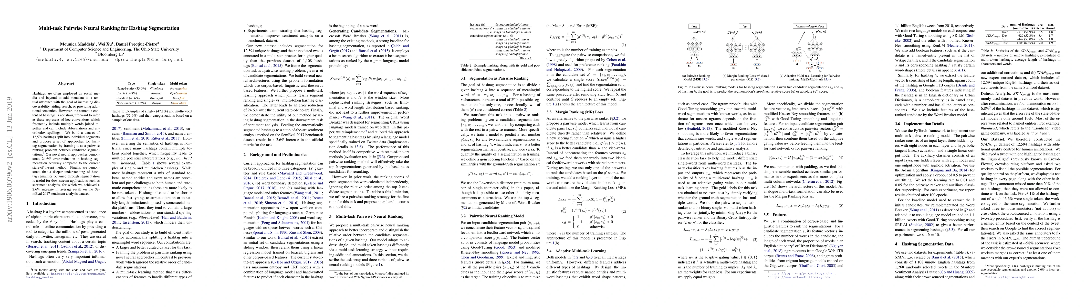 This paper introduces a multi-task pairwise neural ranking method for hashtag segmentation, achieving a 24.6% reduction in error compared to existing techniques. The approach enhances downstream applications like sentiment analysis, improving average recall by 2.6%.