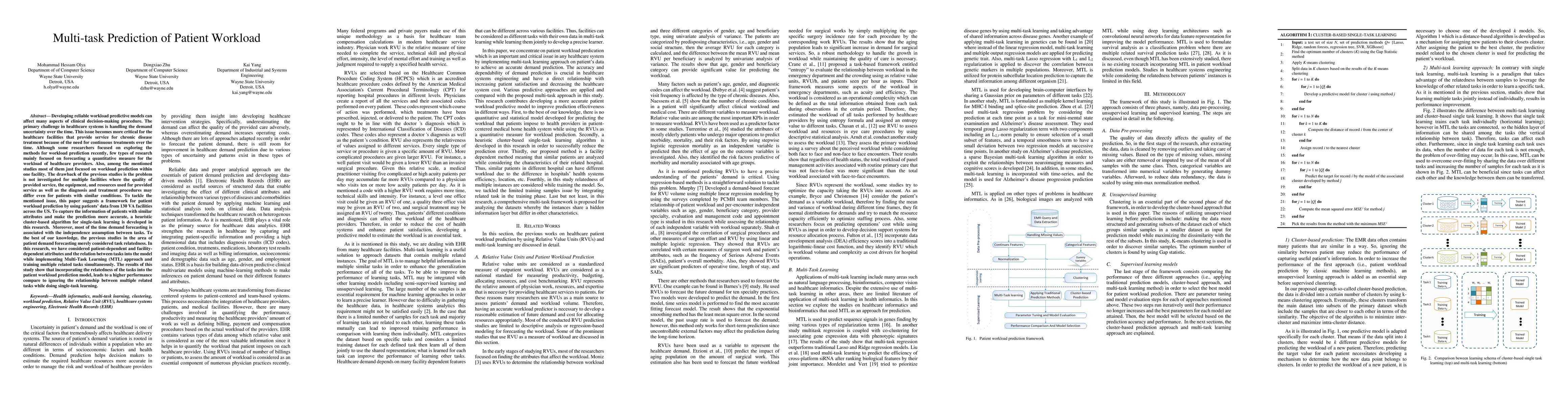 This paper proposes a framework for predicting the workload of healthcare providers by analyzing patient data from multiple VA facilities across the US, introducing a heuristic clustering algorithm and multi-task learning approach to enhance prediction accuracy. The framework addresses the challenge of workload prediction across different facilities, considering varying service qualities and resources.