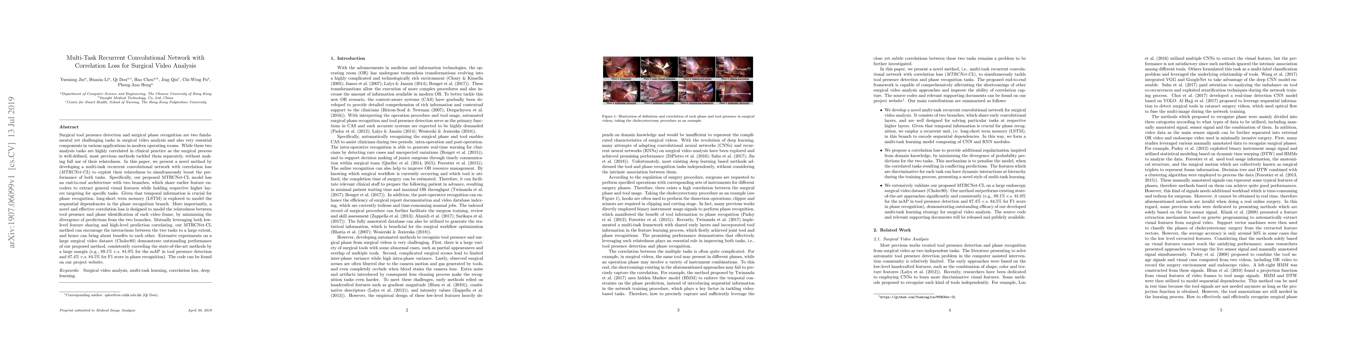Surgical tool presence detection and surgical phase recognition are two fundamental yet challenging tasks in surgical video analysis and also very essential components in various applications in modern operating rooms. While these two analysis tasks are highly correlated in clinical practice as the surgical process is well-defined, most previous methods tackled them separately, without making full use of their relatedness. In this paper, we present a novel method by developing a multi-task recurrent convolutional network with correlation loss (MTRCNet-CL) to exploit their relatedness to simultaneously boost the performance of both tasks. Specifically, our proposed MTRCNet-CL model has an end-to-end architecture with two branches, which share earlier feature encoders to extract general visual features while holding respective higher layers targeting for specific tasks. Given that temporal information is crucial for phase recognition, long-short term memory (LSTM) is explored to model the sequential dependencies in the phase recognition branch. More importantly, a novel and effective correlation loss is designed to model the relatedness between tool presence and phase identification of each video frame, by minimizing the divergence of predictions from the two branches. Mutually leveraging both low-level feature sharing and high-level prediction correlating, our MTRCNet-CL method can encourage the interactions between the two tasks to a large extent, and hence can bring about benefits to each other. Extensive experiments on a large surgical video dataset (Cholec80) demonstrate outstanding performance of our proposed method, consistently exceeding the state-of-the-art methods by a large margin (e.g., 89.1% v.s. 81.0% for the mAP in tool presence detection and 87.4% v.s. 84.5% for F1 score in phase recognition). The code can be found on our project website.