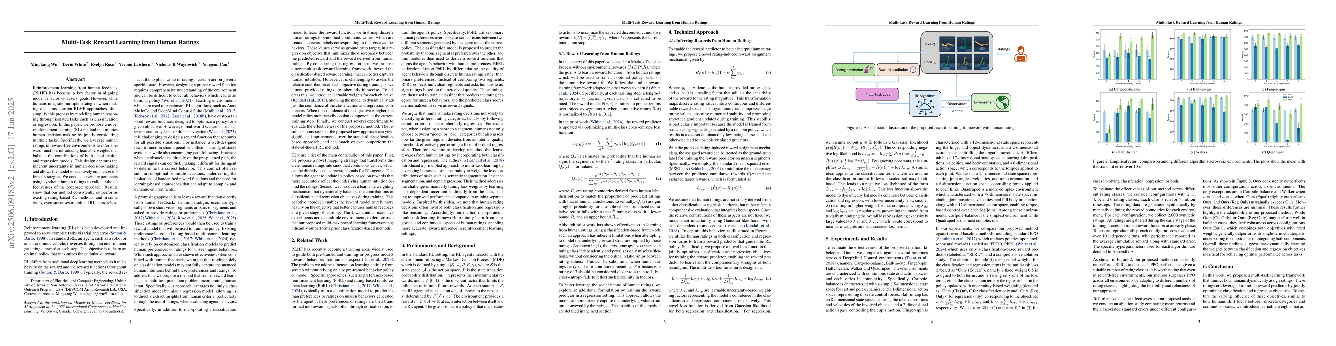 Reinforcement learning from human feeback (RLHF) has become a key factor in aligning model behavior with users' goals. However, while humans integrate multiple strategies when making decisions, current RLHF approaches often simplify this process by modeling human reasoning through isolated tasks such as classification or regression. In this paper, we propose a novel reinforcement learning (RL) method that mimics human decision-making by jointly considering multiple tasks. Specifically, we leverage human ratings in reward-free environments to infer a reward function, introducing learnable weights that balance the contributions of both classification and regression models. This design captures the inherent uncertainty in human decision-making and allows the model to adaptively emphasize different strategies. We conduct several experiments using synthetic human ratings to validate the effectiveness of the proposed approach. Results show that our method consistently outperforms existing rating-based RL methods, and in some cases, even surpasses traditional RL approaches.