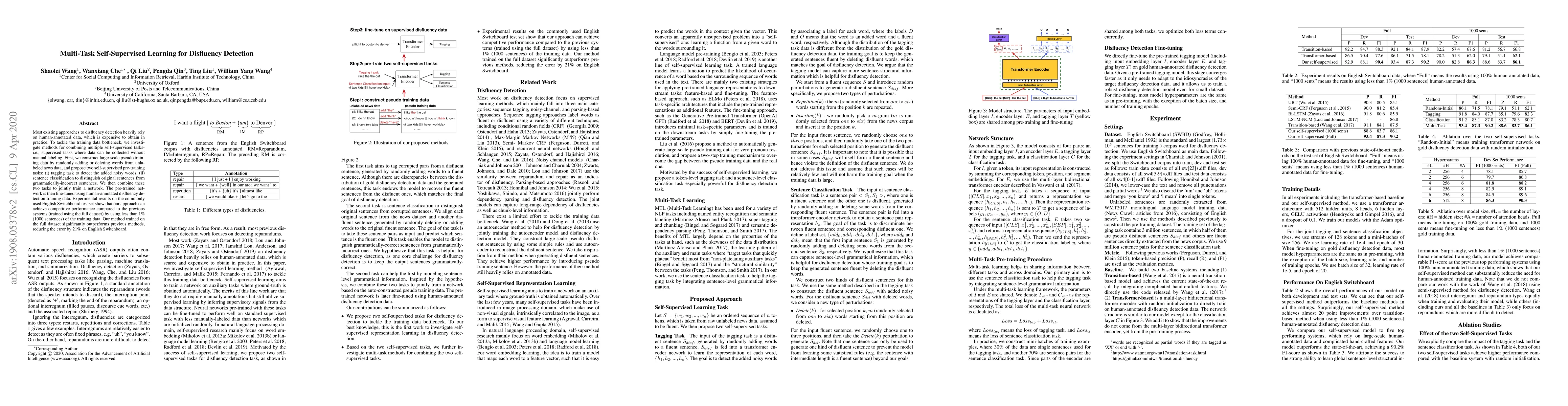 This paper proposes a multi-task self-supervised learning approach to disfluency detection that significantly reduces reliance on expensive human-annotated data. The method uses self-supervised pre-training tasks to generate pseudo data, achieving competitive performance with minimal human-annotated training data.
