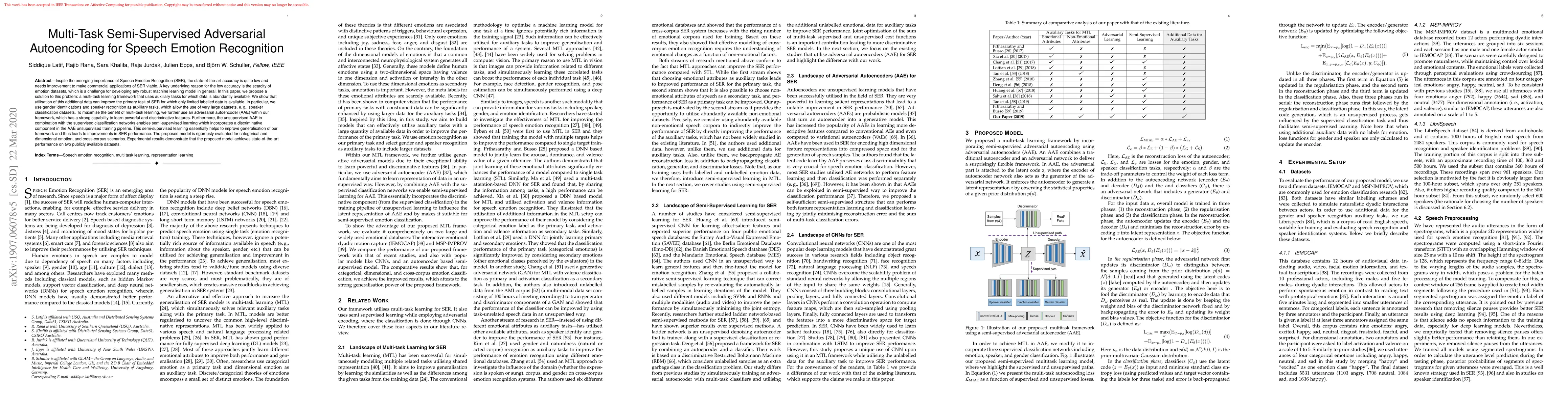 This paper proposes a multi-task semi-supervised adversarial autoencoding framework to enhance Speech Emotion Recognition (SER) by leveraging auxiliary tasks with abundant data, such as gender identification and speaker recognition. The model achieves state-of-the-art performance on two datasets, demonstrating improved SER accuracy despite limited labelled emotion data.