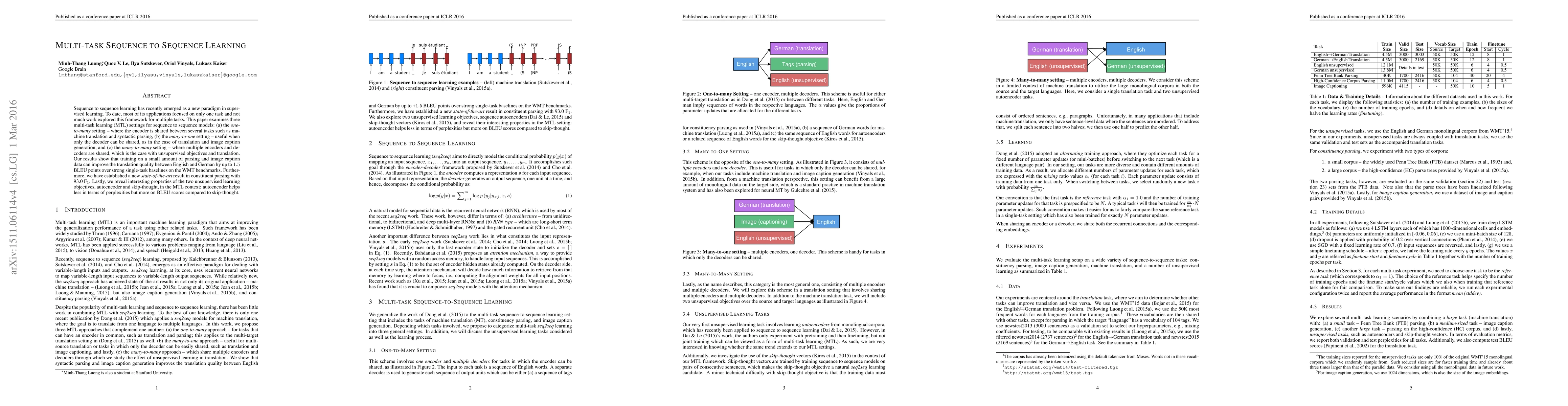 This paper explores multi-task sequence to sequence learning across three settings: one-to-many, many-to-one, and many-to-many, demonstrating improved translation quality and a new state-of-the-art in parsing, while revealing that autoencoders enhance BLEU scores more than skip-thoughts.