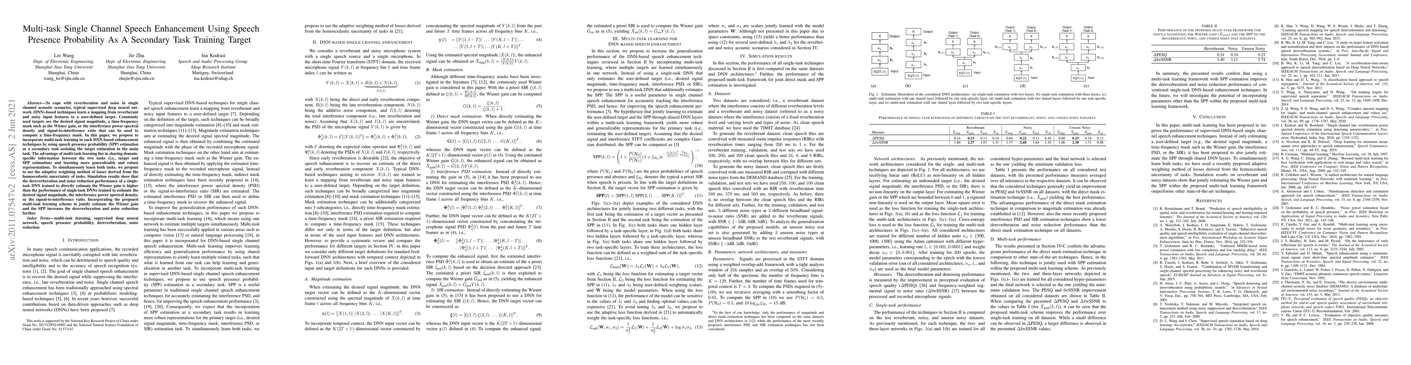 This paper proposes a multi-task learning approach for single-channel speech enhancement using speech presence probability (SPP) estimation as a secondary task. The method enhances dereverberation and noise reduction by sharing domain-specific information between the main task and the SPP estimation, leading to more robust representations.