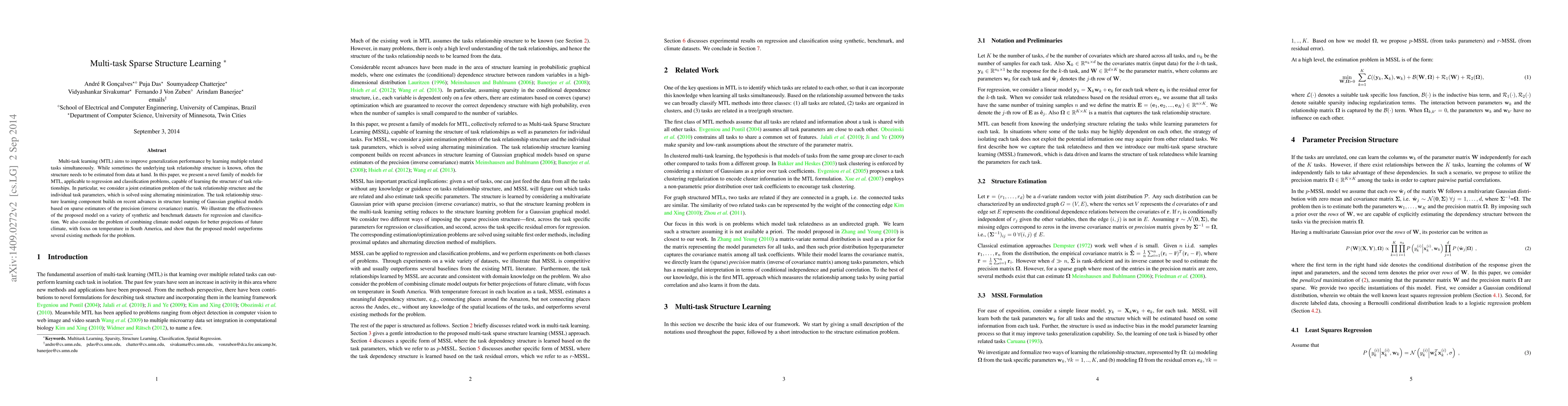 This paper introduces a novel framework for multi-task learning that estimates the underlying task relationship structure through sparse graphical models. The proposed alternating minimization method effectively learns both the task relationships and individual task parameters, demonstrated to outperform existing methods on regression, classification tasks, and climate model projections.