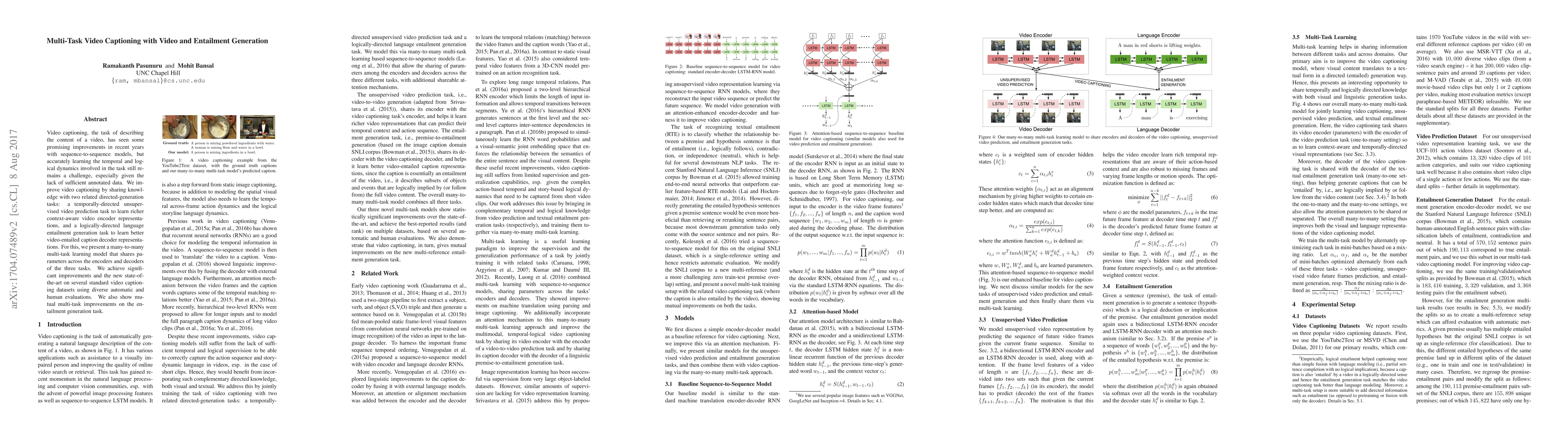 This paper proposes a multi-task learning model to enhance video captioning by leveraging related tasks: unsupervised video prediction and language entailment generation. The model shares parameters across the encoders and decoders of these tasks, leading to significant improvements and state-of-the-art results on video captioning datasets.